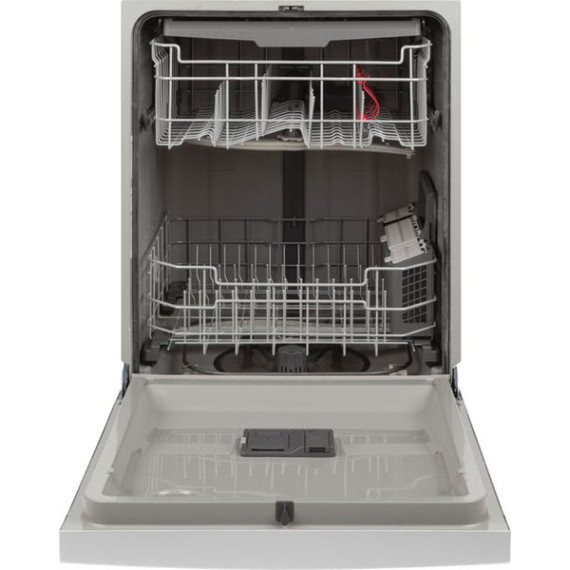 Ensure clean dishes anytime with this 24-inch GE dishwasher. Its adjustable, full-extending upper rack and two stem shelves accommodate a variety of glassware and plates, and the four dedicated water jets provide powerful cleaning for hard-to-reach areas. This GE dishwasher has three wash levels for versatile operation and a hidden vent for quick drying.