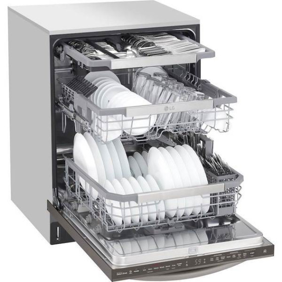 Post-dinner party cleanup? Let your LG dishwasher do the heavy lifting. LG QuadWash™ provides maximum cleaning coverage making it easier than ever to get your dishes clean and with TrueSteam® technology you get up to 60% less water spots. The Glide Rail keeps the upper rack on track while the Ball-bearing wheel provides a smooth lower rack glide for easier loading and unloading. Need more room? No problem. The EasyRack™ Plus system and height-adjustable 3rd rack provide the flexibility you need to fit more dishes.