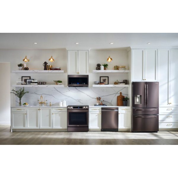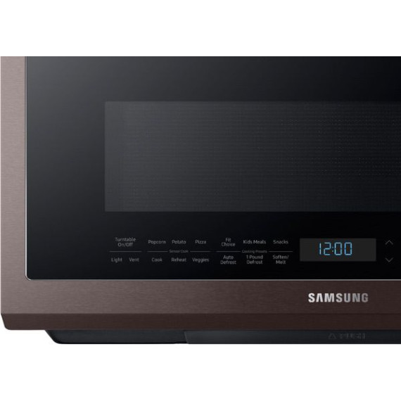 This Samsung over-the-range microwave makes preparing multiple dishes effortless with its 2.1 cu. ft. large capacity, accommodating even your biggest dishes. The Sensor Cook technology automatically adjusts your cooking time for optimal results. Additionally, the ceramic enamel interior features a durable, scratch-resistant, and easy-to-clean surface, making everyday maintenance simple.