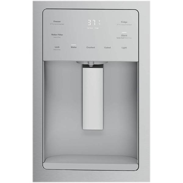Keep fruits and veggies fresh with this GE side-by-side refrigerator. Its extra-tall ice and water dispenser provides both cubed and crushed ice for beverages, and its electronic temperature control monitors the coldness and automatically adjusts to preserve groceries. The five adjustable glass shelves in this 33-inch GE side-by-side refrigerator help you store and organize food items.