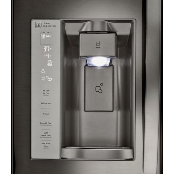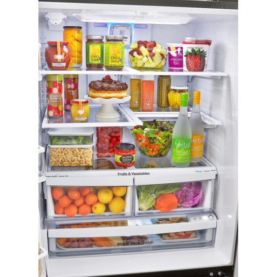 Add a modern edge to your kitchen décor with this LG three-door refrigerator in a bold black stainless steel. French-style doors offer easy access to produce and perishables, while the bottom freezer drawer provides ample space for frozen meats and meals. The Slim SpacePlus icemaker on this LG three-door refrigerator makes a lot of ice without taking up usable space.