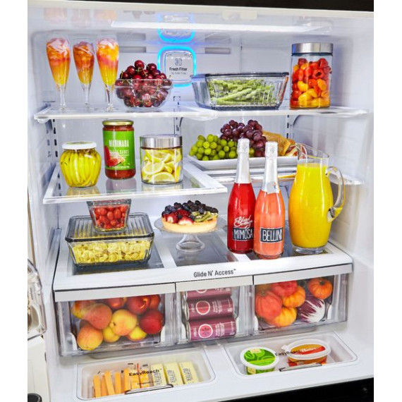 Your kitchen will never be the same. With the latest technology in refrigeration, youll enjoy crisp, cool food and exciting features every day. This fresh LG fridge offers a glass panel design, premium LED lighting, energy-saving access to groceries, and an app that lets you control the fridge from anywhere.