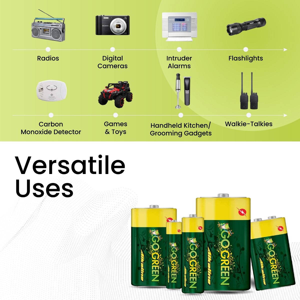 GoGreen Power Alkaline C batteries are an ideal choice for all your high-draining devices. This pack of 24 C batteries are the perfect choice for eco-conscious customers. We need batteries to power critical devices in our lives, but disposing of them in a landfill is bad for the environment. As they break down, they can leak chemicals into groundwater and release known carcinogens. Our alkaline batteries contain no lead, cadmium, or mercury. These C batteries have a lifespan and performance comparable to the top brands on the market but with a green mindset. Due to the lack of these chemicals, even if the batteries do end up in landfills, they will not leak harmful chemicals into the groundwater or land. These alkaline batteries are made of manganese dioxide, & contain no cadmium or lead. It is suggested to use alkaline batteries for your high drain power devices, such as flashlights, television remotes, or even smoke detectors. By purchasing this pack of 24 alkaline batteries, you not only will get a high-quality product; but also get ecological peace of mind with hassle-free recycling. We offer free recycling and free shipping back of the used product to our recycling facility. Please view the recycling code and instructions on the back of the package and visit the GoGreen Power website for additional information.