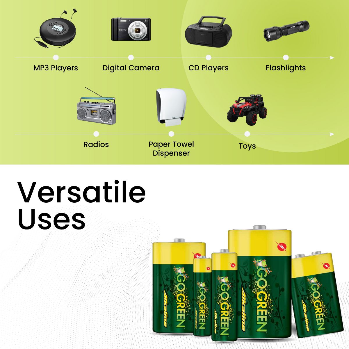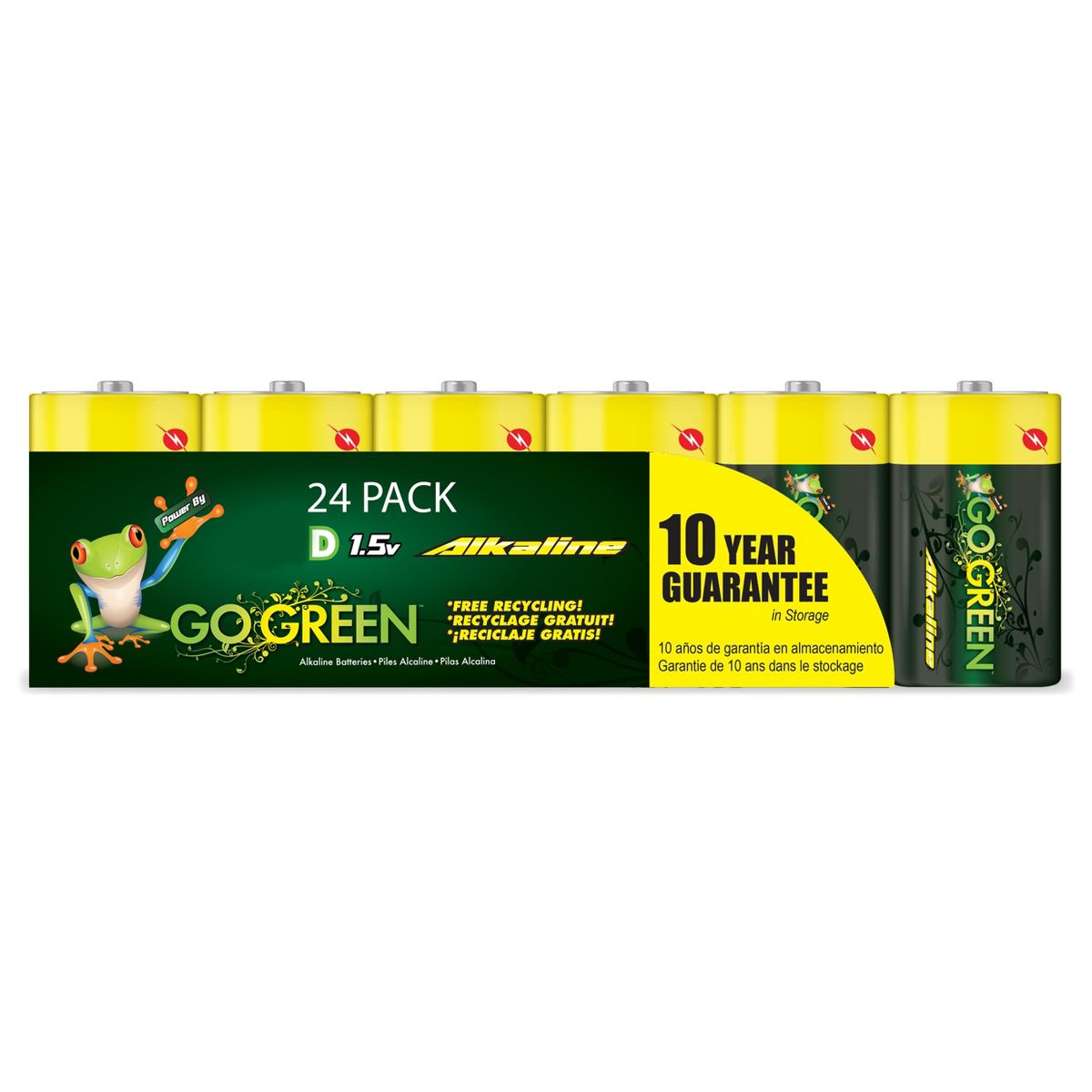 GoGreen Power Alkaline AA batteries are an ideal choice for all your high-draining devices. This pack of 24 D batteries are the perfect choice for eco-conscious customers. We need batteries to power critical devices in our lives, but disposing of them in a landfill is bad for the environment. As they break down, they can leak chemicals into groundwater and release known carcinogens. Our alkaline batteries contain no lead, cadmium, or mercury. These D batteries have a lifespan and performance comparable to the top brands on the market but with a green mindset. Due to the lack of these chemicals, even if the batteries do end up in landfills, they will not leak harmful chemicals into the groundwater or land. These alkaline batteries are made of manganese dioxide, & contain no cadmium or lead. It is suggested to use alkaline batteries for your high drain power devices, such as flashlights, television remotes, toys and much more! By purchasing this pack of 24 alkaline batteries, you not only will get a high-quality product; but also get ecological peace of mind with hassle-free recycling. We offer free recycling and free shipping back of the used product to our recycling facility. Please view the recycling code and instructions on the back of the package and visit the GoGreen Power website for additional information.