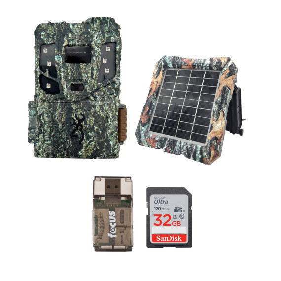 Browning Defender Pro Scout Max Extreme HD Cellular Trail Camera with GPS Images and Smart IR VideoThe Browning Defender Pro Scout Max Extreme Cellular Trail Camera delivers the most complete cell camera experience for users of any experience level at a reasonable price. Whether it is scouting your favorite hunting property or using them as a cost-effective security camera, the versatility of this camera offers users around the clock, high-end performance.FunctionsEquipped with Browning’s innovative Dual Carrier Technology, these cameras come with pre-installed ATT and Verizon SIM cards that combine with Browning’s new Auto-Detect feature to help users identify the best signal available to them in the field. Additionally, the Pro Scout MAX Extreme cameras have 22MP image capability, full HD 1080p video capability with sound, and cutting edge RADIANT 6 Night Illumination Technology that combine to deliver users the best daytime and nighttime images and videos possible. CapacityWith adjustable IR flash settings that extend up to 120 feet, super-fast .25 second triggers speeds, and GPS tagged images, this camera creates a remarkable experience that is only further enhanced by industry defining battery life that gives these cameras the potential to operate for up to 1 year in the field on a set of 8 AA batteries.Browning Trail Cameras Solar Power Pack (Camo)The New Solar Camera Power Pack is compatible with all of the trail camera models, and provides a constant power source for your camera in the field. The Power pack includes 6 AA NiMH rechargeable batteries that are constantly being recharged by the highly efficient solar cell to keep your cameras running strong in the field. The solar pack mounts easily to any tree, or can be used with our line of camera mounts. The solar panel can be easily adjusted to the perfect angle to maximize solar power output.SanDisk 32GB Ultra SDHC UHS-I Memory Card (100MB/s)The SanDisk 32GB Ultra SDHC UHS-I Memory Card allows you to capture better pictures and Full HD videos with your compact to mid-range point and shoot cameras. Store tons of photos and videos, with speeds up to 100MB/s to quickly transfer it all to your computer.Capture the MomentThis SanDisk Ultra SD card delivers exceptional photo and video shooting performance to let you capture your memories when they happen.Picture and VideoCapture amazing quality pictures and Full HD video with your compact point-and-shoot camera.Keep ShootingShoot tons of photos and hours of Full HD video (1080p) without changing the card.DurableThis SanDisk Ultra SD card is durable and tested to protect your memories from life’s mishaps—waterproof, shockproof, x-ray proof, and temperature-proof.Focus All-In-One High Speed Card ReaderTransfer data to and from your PC with this All-In-One High-Speed USB 2.0 Card Reader by Focus Camera. The high-speed memory card reader provides a transfer rate of 480 Mbps and supports most media cards, including SD, SDHC, micro SD, MMC, TF, M2, and PRO Duo cards. Compatible with both Mac and PC systems, this USB card reader is made with a plastic shell that is exceptionally durable..