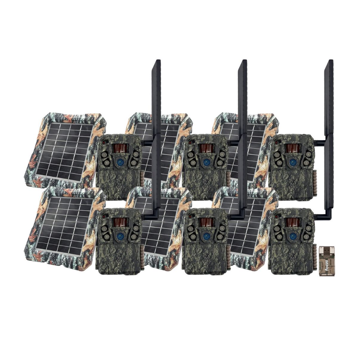Browning Trail Camera Defender Wireless Vision Pro HD AI 46MP (6 Pack)Unleash the power of intelligent wildlife scouting with the Defender Vision Pro HD AI by Browning Trail Cameras. This game-changing camera combines advanced AI technology with unparalleled imaging capabilities, putting you in control of what you see and when you see it. No more sifting through endless photos of non-target animals – this smart AI camera filters out irrelevant images, focusing on the shots you want. Through the Strike Force Wireless app, instantly access only the images that matter, streamlining your scouting and maximizing your time in the field.Crystal-Clear Imaging & On-Demand AccessEvery detail of the wild is at your fingertips with 46MP images and 1080p HD video recording. The Defender Vision Pro HD AI’s high-speed image uploads mean you’re always just a click away from real-time, all-HD visuals of your target environment. From sunrise to starlit nights, capture high-definition scenes with brilliant clarity, thanks to the ultra-responsive high-gain cellular antenna, ensuring rapid uploads from anywhere in the field.Unbeatable Speed, Night Vision, and Field ManagementWith a lightning-fast 0.135-second trigger speed, 0.5-second recovery time, and a remarkable 110-foot infrared illumination range, this camera guarantees you capture every critical moment – day or night. Browning’s Illuma-Smart Technology intelligently adjusts the IR flash for pristine night images, with adjustable flash modes (Power Save, Fast Motion, Long Range) to suit any environment. Built-in GPS tagging enhances security and lets you locate your camera at a moment’s notice, ensuring worry-free scouting.Control at Your FingertipsThe Defender Vision Pro HD AI offers unmatched convenience with the Strike Force Wireless app. Organize and map GPS-tagged images, manage folders effortlessly, and enjoy on-demand updates with scheduled or instant uploads. Activate the camera only when you need it with month-to-month data plans – no commitments required. Stay informed on the go with real-time notifications via email or text, giving you complete control and peace of mind.Built to Keep Up with YouWith extended battery life on just 8 AA batteries and support for an external 12-volt power source, this camera is ready for the long haul. Store up to 512GB of data with an SDXC card, so you never miss a single frame, and capture every second with Smart IR Video and multi-shot options.Browning Trail Cameras Solar Power Pack (Camo)The New Solar Camera Power Pack is compatible with all of the trail camera models and provides a constant power source for your camera in the field. The Power Pack includes 6 AA NiMH rechargeable batteries that are constantly being recharged by the highly efficient solar cell to keep your cameras running strong in the field. The solar pack mounts easily to any tree or can be used with our line of camera mounts. The solar panel can be easily adjusted to the perfect angle to maximize solar power output.All-In-One High Speed Card ReaderTransfer data to and from your PC with this All-In-One High-Speed USB 2.0 Card Reader. The high-speed memory card reader provides a transfer rate of 480 Mbps and supports most media cards, including SD, SDHC, micro SD, MMC, TF, M2, and PRO Duo cards. Compatible with both Mac and PC systems, this USB card reader is made with a plastic shell that is exceptionally durable..