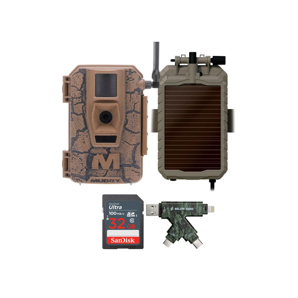 Muddy Mitigator Cellular 24MP Imaging Trail Camera with 80 Feet Detection and Flash RangeStealth Cam Lithium Solar Power PanelDesigned as a sustainable solution for all trail cameras especially wireless/cellular trail cameras, this 12V Amorphous Solar Power Panel runs on 1000mAh Li-ion battery that works in low light conditions. The notification LED indicates battery level. All-weather construction ensures durability. It features 10-feet insulated metal cable. Also easily mounts to trees and posts with a durable nylon strap and serrated brackets.SanDisk 32GB Ultra SDHC UHS-I Memory Card (100MB/s)The SanDisk 32GB Ultra SDHC UHS-I Memory Card allows you to capture better pictures and Full HD videos with your compact to mid-range point and shoot cameras. Store tons of photos and videos, with speeds up to 100MB/s to quickly transfer it all to your computer.Capture the MomentThis SanDisk Ultra SD card delivers exceptional photo and video shooting performance to let you capture your memories when they happen.Picture and VideoCapture amazing quality pictures and Full HD video with your compact point-and-shoot camera.Keep ShootingShoot tons of photos and hours of Full HD video (1080p) without changing the card.DurableThis SanDisk Ultra SD card is durable and tested to protect your memories from life’s mishaps—waterproof, shockproof, x-ray proof, and temperature-proof.Focus All-In-One High Speed Card ReaderTransfer data to and from your PC with this All-In-One High-Speed USB 2.0 Card Reader by Focus Camera. The high-speed memory card reader provides a transfer rate of 480 Mbps and supports most media cards, including SD, SDHC, micro SD, MMC, TF, M2, and PRO Duo cards. Compatible with both Mac and PC systems, this USB card reader is made with a plastic shell that is exceptionally durable..