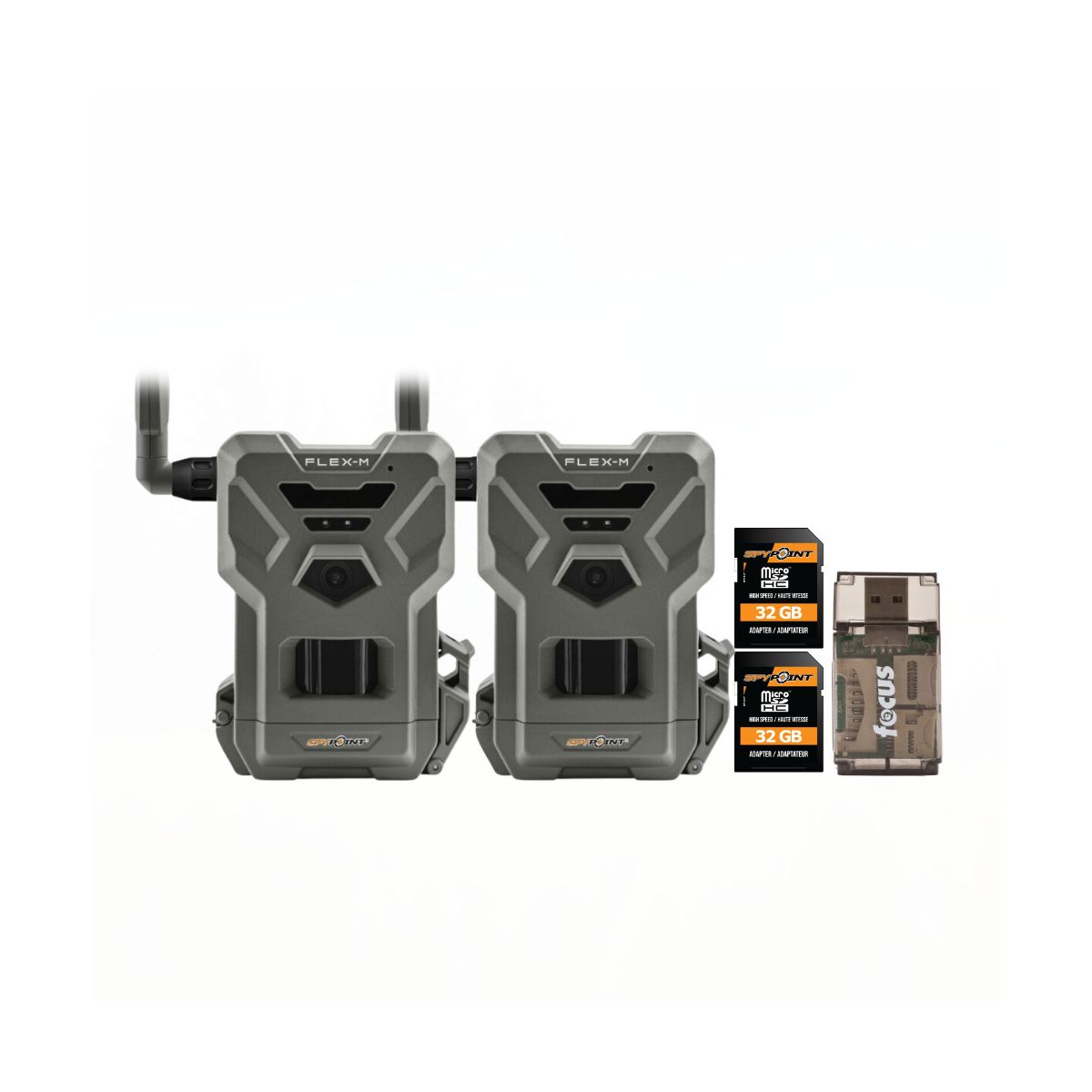 Spypoint Flex M 28 Megapixel Cellular Trail Camera with Dual-SimSpypoint MicroSD 32GB Ultra High Speed Class 10 Memory CardFocus All-In-One High Speed Card ReaderTransfer data to and from your PC with this All-In-One High-Speed USB 2.0 Card Reader by Focus Camera. The high-speed memory card reader provides a transfer rate of 480 Mbps and supports most media cards, including SD, SDHC, micro SD, MMC, TF, M2, and PRO Duo cards. Compatible with both Mac and PC systems, this USB card reader is made with a plastic shell that is exceptionally durable..