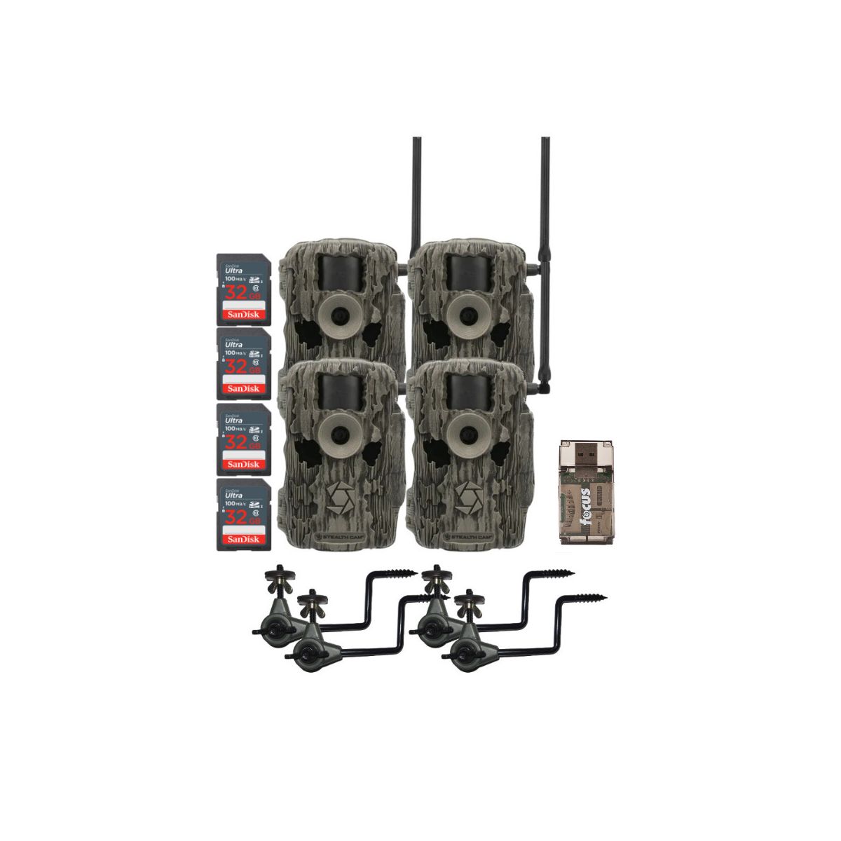 Stealth Cam 36MP Fusion Max Cellular Trail Camera with 80-Feet Detection Range (2-Pack)HME Products Economy Trail Camera HolderThis HME Economy Trail Camera Holder offers a 220-degree of vertical adjustment and a full 360-degree of rotational adjustment. It is designed with a compact and sturdy build in order to support trail cameras with a 1/4-inch x 20mm threaded insert on the bottom. Install the holder on a tree and simply screw the trail camera onto the threaded end of the mount, then rotate to your desired position. You can then screw the camera's locking knob up and against the bottom of the camera to secure that position. Afterwards, continue on by loosening the 3/8-inch wing nut of the vertical adjustment and pivot camera into position before re-tightening the wing nut.SanDisk 32GB Ultra SDHC UHS-I Memory Card (100MB/s)The SanDisk 32GB Ultra SDHC UHS-I Memory Card allows you to capture better pictures and Full HD videos with your compact to mid-range point and shoot cameras. Store tons of photos and videos, with speeds up to 100MB/s to quickly transfer it all to your computer.Capture the MomentThis SanDisk Ultra SD card delivers exceptional photo and video shooting performance to let you capture your memories when they happen.Picture and VideoCapture amazing quality pictures and Full HD video with your compact point-and-shoot camera.Keep ShootingShoot tons of photos and hours of Full HD video (1080p) without changing the card.DurableThis SanDisk Ultra SD card is durable and tested to protect your memories from life’s mishaps—waterproof, shockproof, x-ray proof, and temperature-proof.Focus All-In-One High Speed Card ReaderTransfer data to and from your PC with this All-In-One High-Speed USB 2.0 Card Reader by Focus Camera. The high-speed memory card reader provides a transfer rate of 480 Mbps and supports most media cards, including SD, SDHC, micro SD, MMC, TF, M2, and PRO Duo cards. Compatible with both Mac and PC systems, this USB card reader is made with a plastic shell that is exceptionally durable..