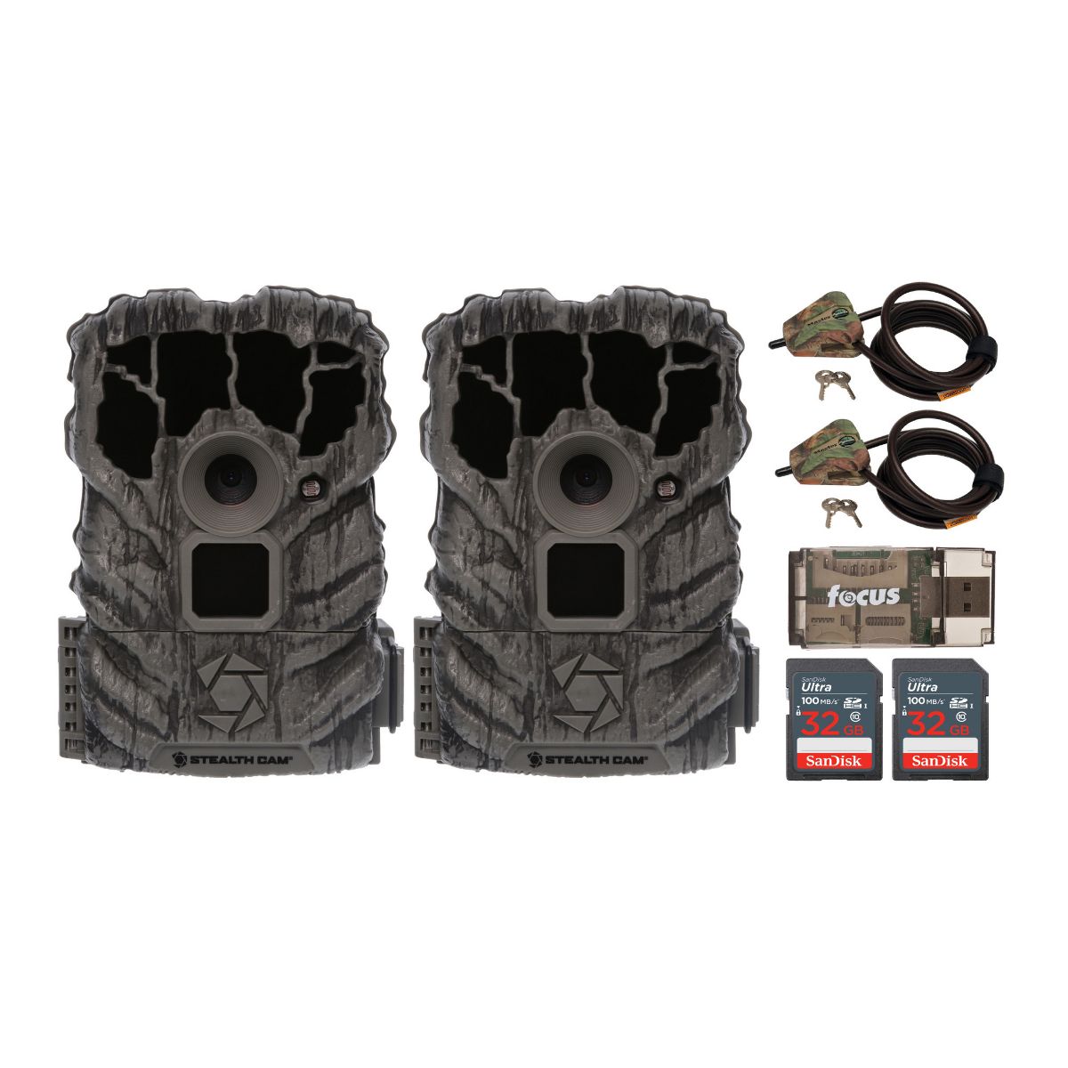 Stealth Cam Revolver 40MP Pro 360-Degree Cellular Trail Camera with 1/4-Inch Threaded MountStealth Cam Sol-Pak 5000mAh Lithium-Ion Solar Battery for 12V DC Jack with LED-IndicatorSanDisk 32GB Ultra SDHC UHS-I Memory Card (100MB/s)The SanDisk 32GB Ultra SDHC UHS-I Memory Card allows you to capture better pictures and Full HD videos with your compact to mid-range point and shoot cameras. Store tons of photos and videos, with speeds up to 100MB/s to quickly transfer it all to your computer.Capture the MomentThis SanDisk Ultra SD card delivers exceptional photo and video shooting performance to let you capture your memories when they happen.Picture and VideoCapture amazing quality pictures and Full HD video with your compact point-and-shoot camera.Keep ShootingShoot tons of photos and hours of Full HD video (1080p) without changing the card.DurableThis SanDisk Ultra SD card is durable and tested to protect your memories from life’s mishaps—waterproof, shockproof, x-ray proof, and temperature-proof.Focus All-In-One High Speed Card ReaderTransfer data to and from your PC with this All-In-One High-Speed USB 2.0 Card Reader by Focus Camera. The high-speed memory card reader provides a transfer rate of 480 Mbps and supports most media cards, including SD, SDHC, micro SD, MMC, TF, M2, and PRO Duo cards. Compatible with both Mac and PC systems, this USB card reader is made with a plastic shell that is exceptionally durable..