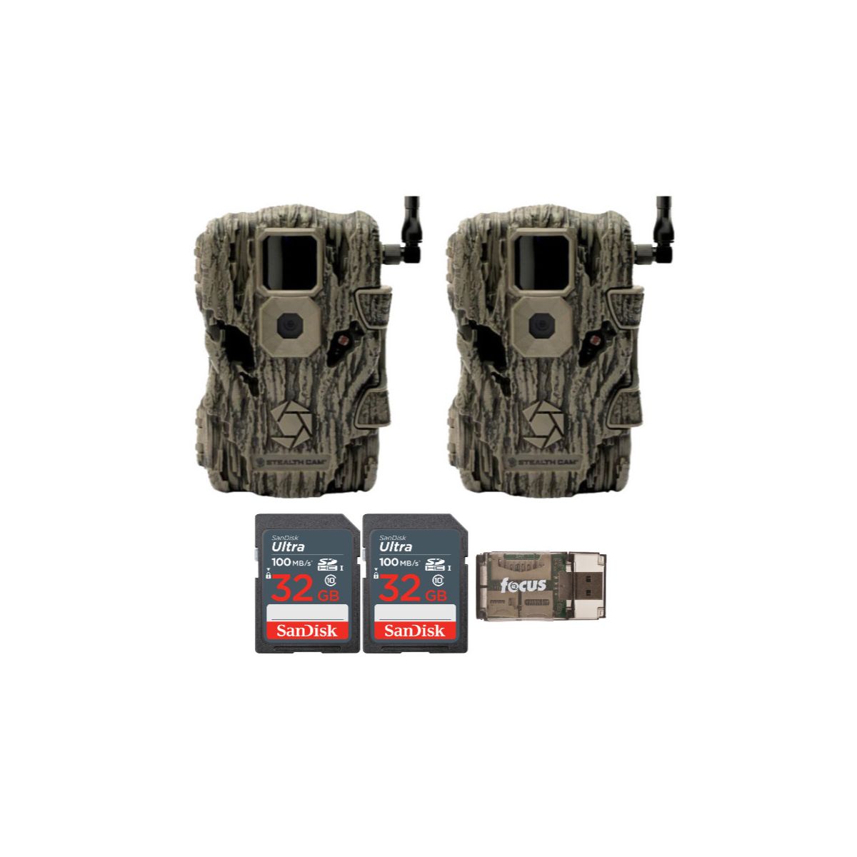 Stealth Cam Fusion X 26MP Trail CameraFusion Wireless Cameras take the guesswork out of cellular activation and will have you transmitting images in a matter of minutes with their quick scan QR setup. Combined with Stealth Cam’s new data plans, Fusion offers affordable options for every budget and need. Available on AT and T.SanDisk 32GB Ultra SDHC UHS-I Memory CardThe SanDisk 32GB Ultra SDHC UHS-I Memory Card allows you to capture better pictures and Full HD videos with your compact to mid-range point and shoot cameras. Store tons of photos and videos, with speeds up to 100MB/s to quickly transfer it all to your computer.Capture the MomentThis SanDisk Ultra SD card delivers exceptional photo and video shooting performance to let you capture your memories when they happen.Picture and VideoCapture amazing quality pictures and Full HD video with your compact point-and-shoot camera.Keep ShootingShoot tons of photos and hours of Full HD video (1080p) without changing the card.DurableThis SanDisk Ultra SD card is durable and tested to protect your memories from life’s mishaps, waterproof, shockproof, x-ray proof, and temperature-proof.Focus All-In-One High Speed USB 2.0 Card ReaderTransfer data to and from your PC with this All-In-One High-Speed USB 2.0 Card Reader by Focus Camera. The high-speed memory card reader provides a transfer rate of 480 Mbps and supports most media cards, including SD, SDHC, micro SD, MMC, TF, M2, and PRO Duo cards. Compatible with both Mac and PC systems, this USB card reader is made with a plastic shell that is exceptionally durable..