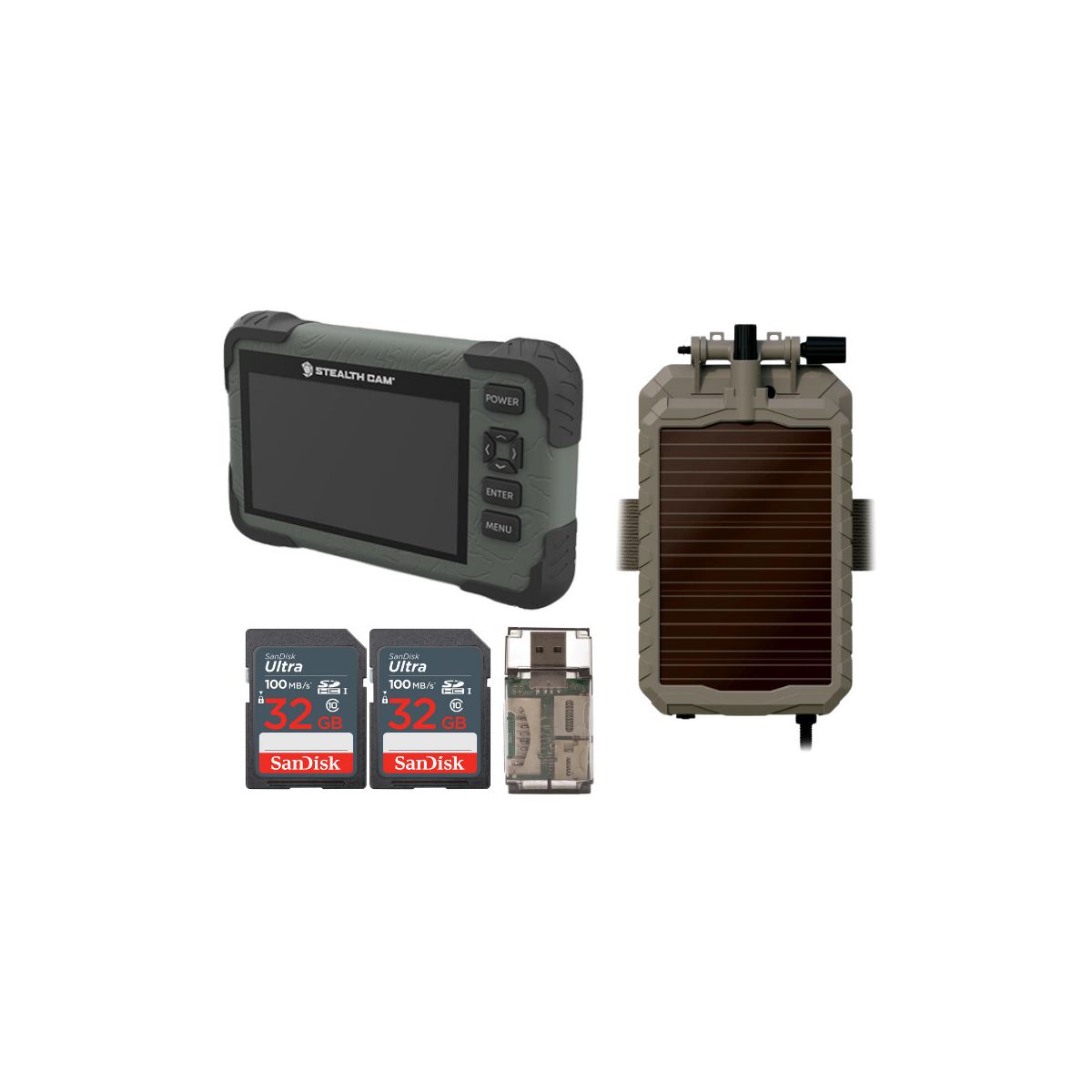 Stealth Cam Revolver 40MP Pro 360-Degree Cellular Trail Camera with 1/4-Inch Threaded MountStealth Cam Sol-Pak 5000mAh Lithium-Ion Solar Battery for 12V DC Jack with LED-IndicatorSanDisk 32GB Ultra SDHC UHS-I Memory Card (100MB/s)The SanDisk 32GB Ultra SDHC UHS-I Memory Card allows you to capture better pictures and Full HD videos with your compact to mid-range point and shoot cameras. Store tons of photos and videos, with speeds up to 100MB/s to quickly transfer it all to your computer.Capture the MomentThis SanDisk Ultra SD card delivers exceptional photo and video shooting performance to let you capture your memories when they happen.Picture and VideoCapture amazing quality pictures and Full HD video with your compact point-and-shoot camera.Keep ShootingShoot tons of photos and hours of Full HD video (1080p) without changing the card.DurableThis SanDisk Ultra SD card is durable and tested to protect your memories from life’s mishaps—waterproof, shockproof, x-ray proof, and temperature-proof.Focus All-In-One High Speed Card ReaderTransfer data to and from your PC with this All-In-One High-Speed USB 2.0 Card Reader by Focus Camera. The high-speed memory card reader provides a transfer rate of 480 Mbps and supports most media cards, including SD, SDHC, micro SD, MMC, TF, M2, and PRO Duo cards. Compatible with both Mac and PC systems, this USB card reader is made with a plastic shell that is exceptionally durable..