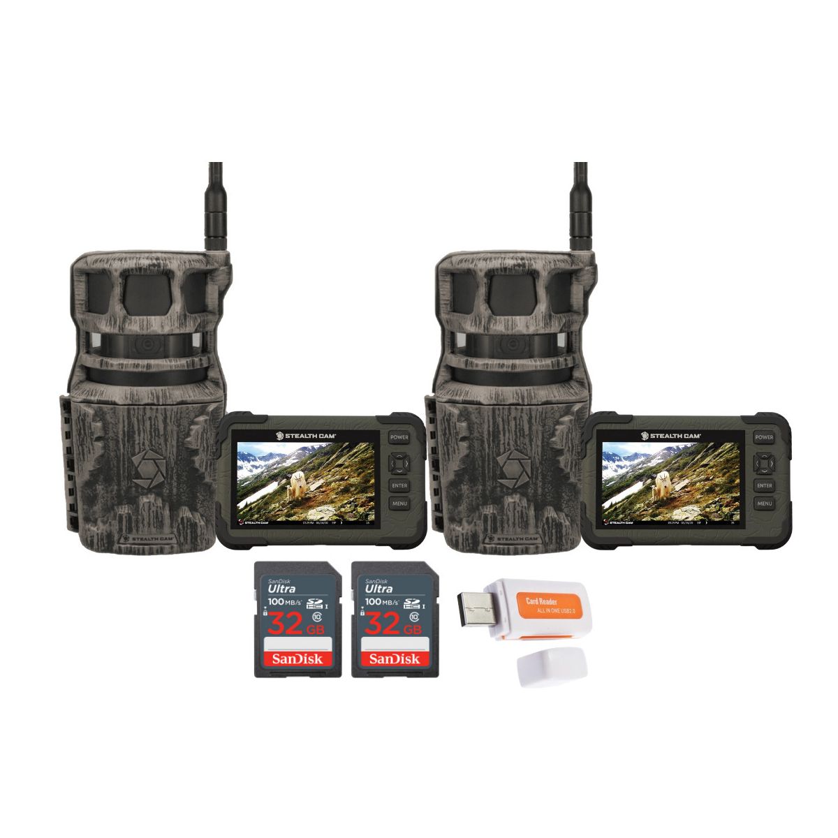 Stealth Cam Revolver 36MP Pro 360 Degree Cellular Trail Camera with Card Viewer 32GB Memory Cards and Card Reader (2 Pack)