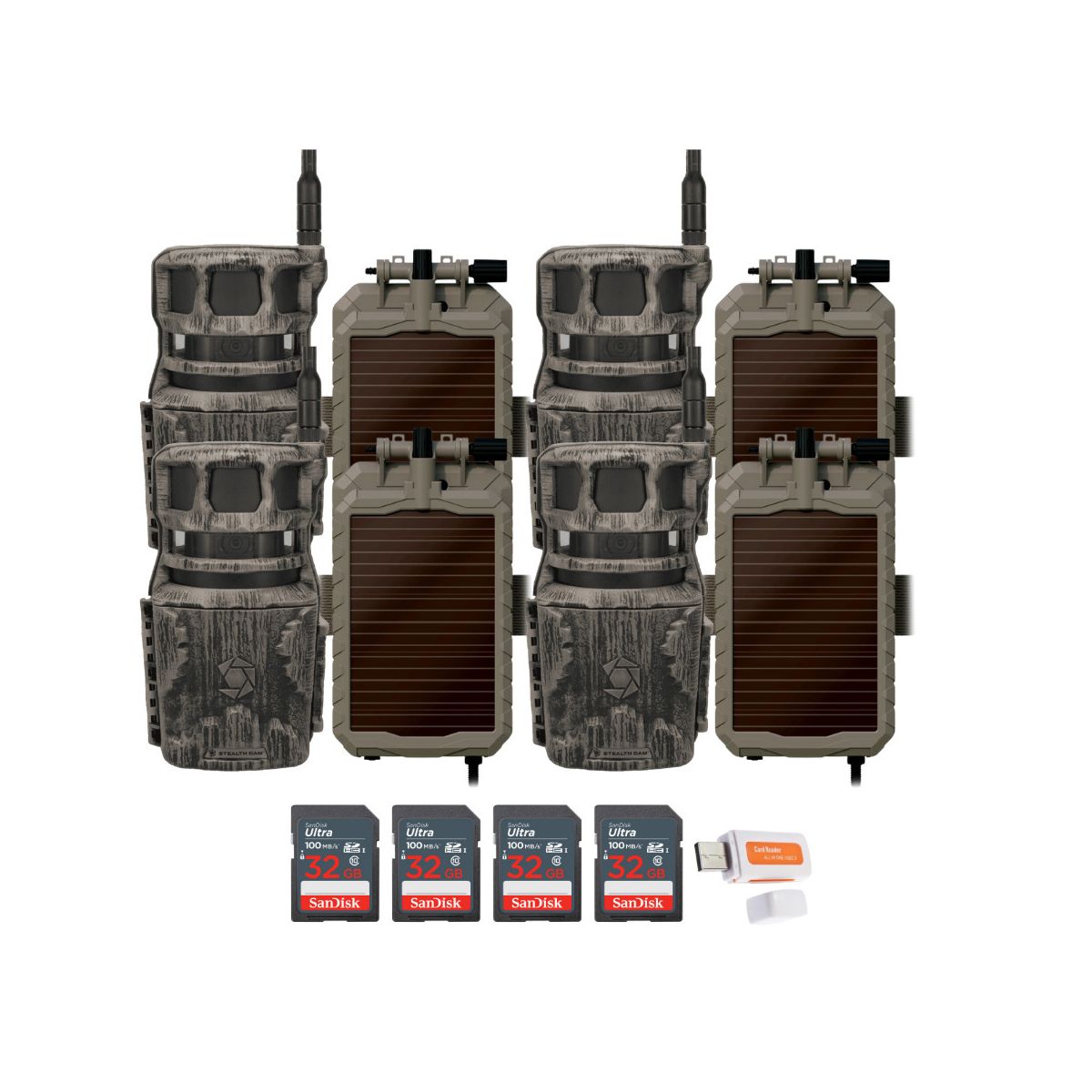 Stealth Cam Revolver 36MP Pro 360 Degree Cellular Trail Camera with Solar Battery Pack 32GB Memory Cards and Card Reader (4 Pack)