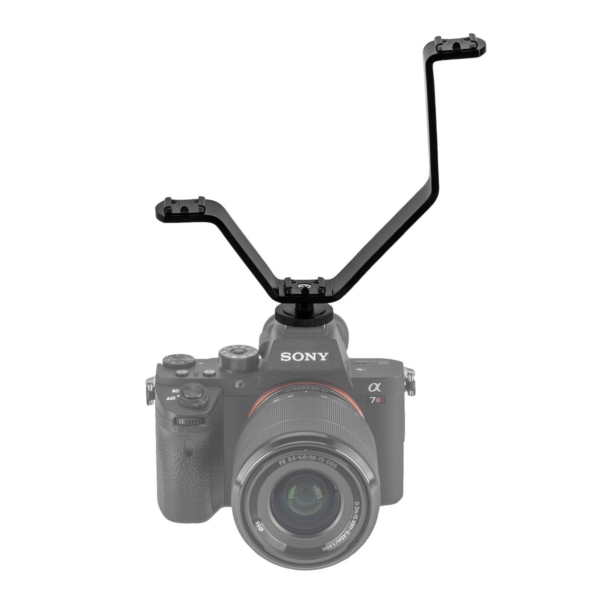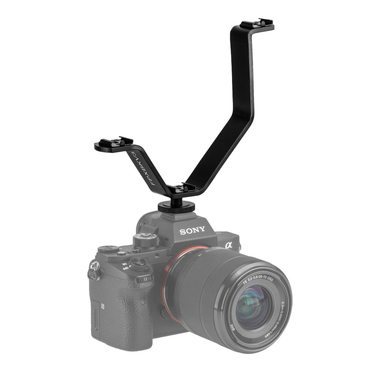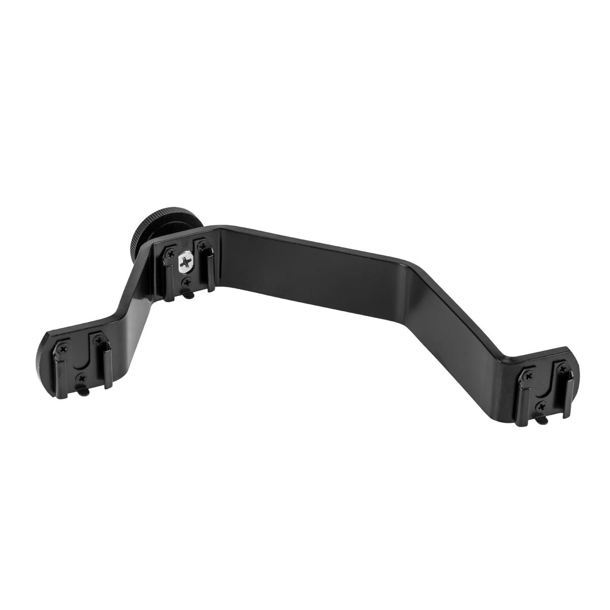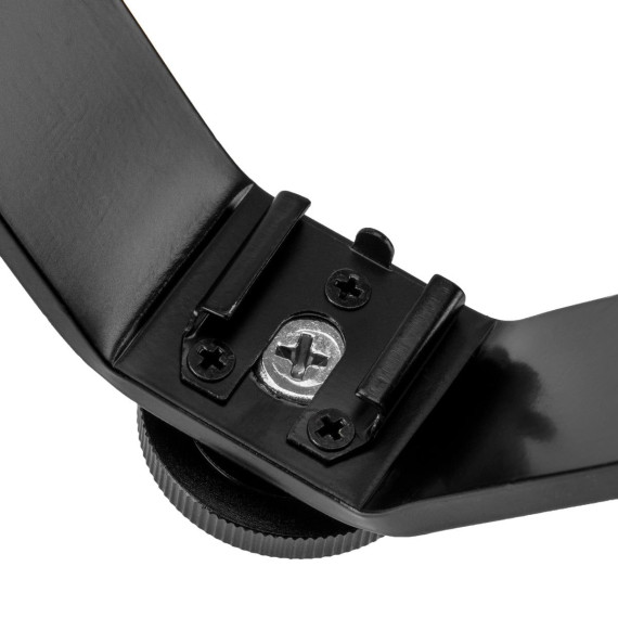 The Flashpoint Triple Shoe V-Bracket allows you to connect 3 shoe mounted devices at different levels on top of one camera’s flash shoe. By staggering the height, you have ample room, without interference, for gear like mics, a lav mic receiver, LED lights, audio recorders, a monitor, viewfinder mount, or any other shoe accessory. The higher, more extended upper shoe arm allows you to place your LED panel farther from the lens, reducing interference with other systems and adding drama and realism to your lighting The Triple Shoe V-Bracket connects to a camera using a standard cold shoe, and it can also be mounted to a ¼” screw on a stand, tripod, or other device. The all aluminum alloy construction is lightweight and strong. Each cold shoe has a safety pin to prevent misalignment and rotation of the mounted accessory.