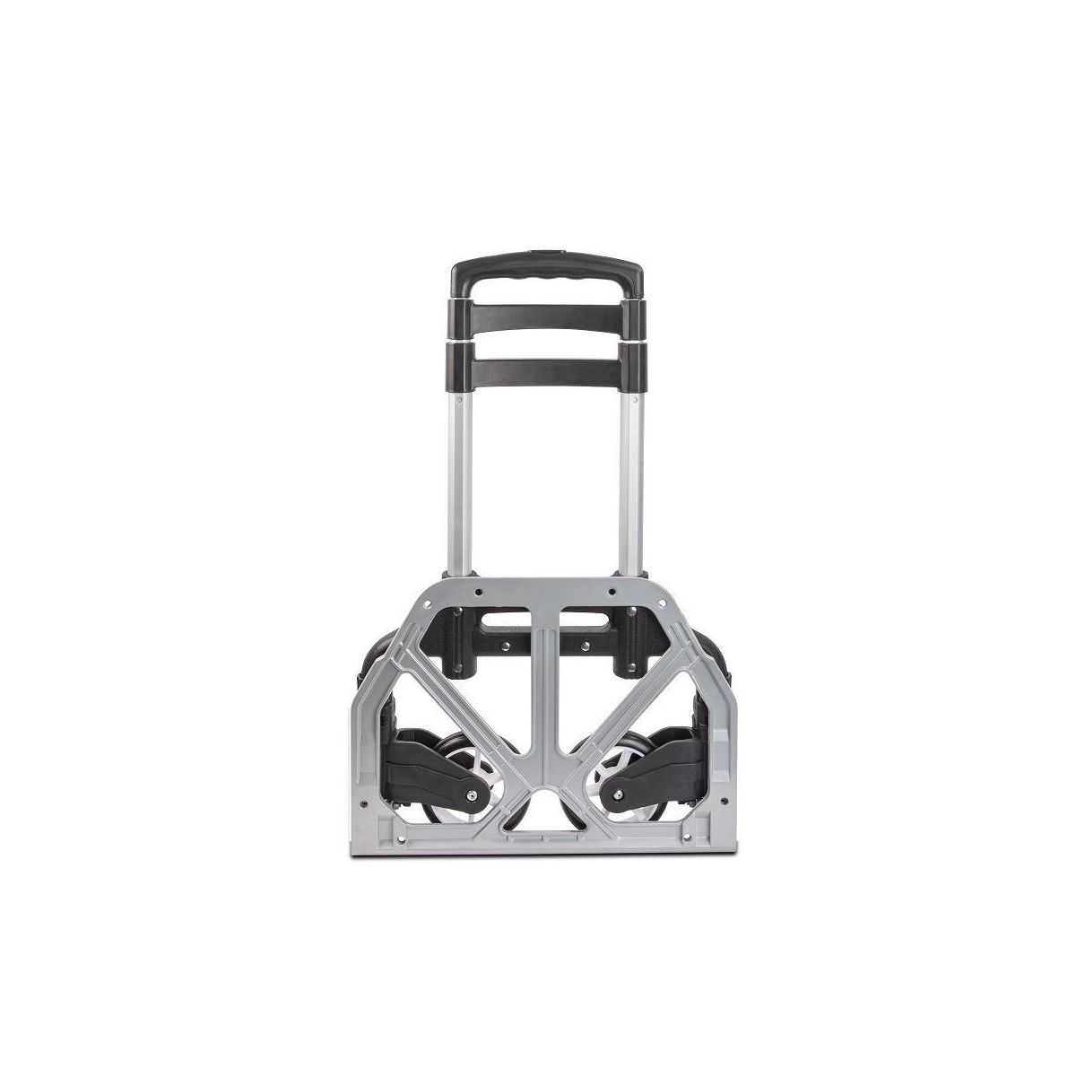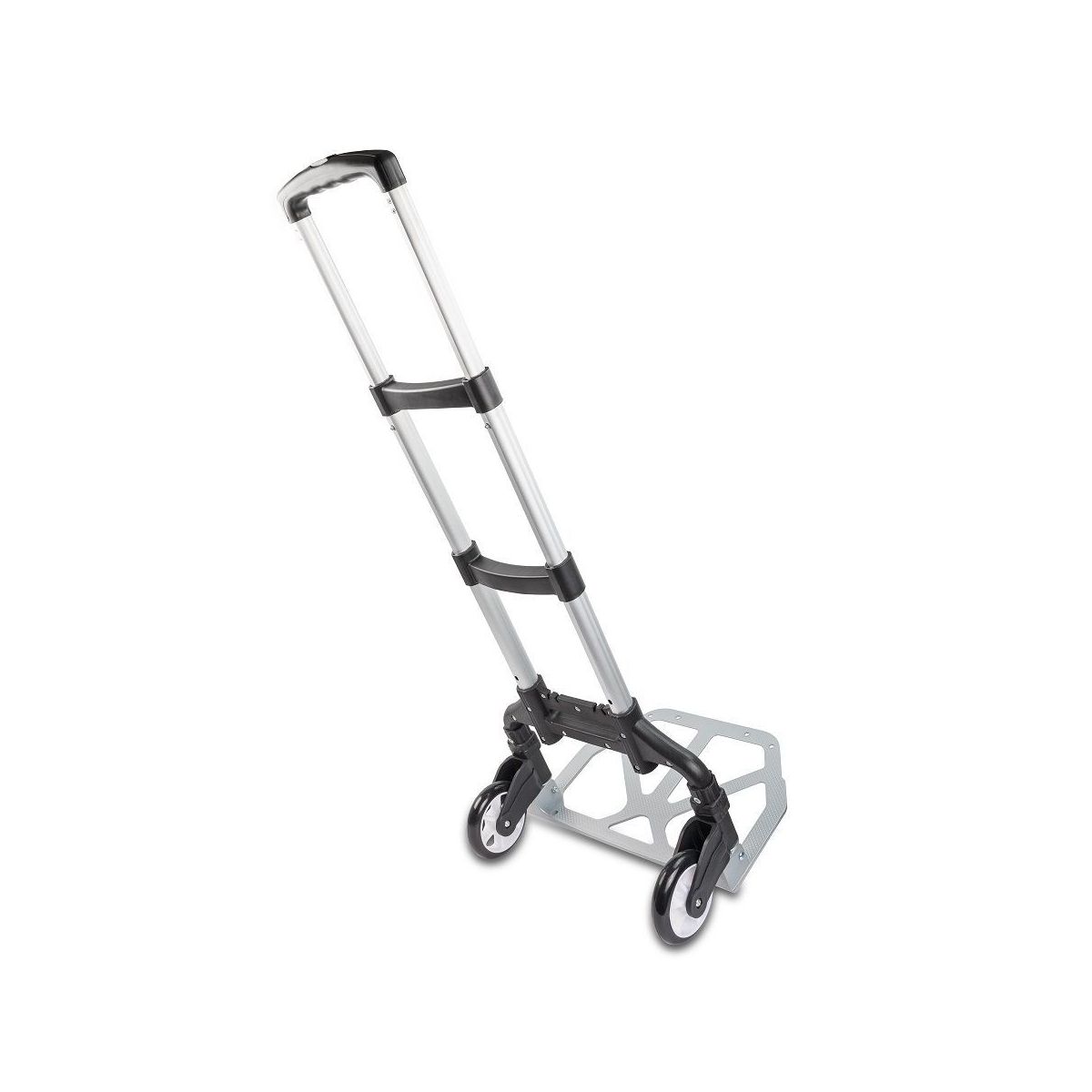 The whole hand truck can be folded up to be just 2.5" thick, and the wheels fold into the hand truck body automatically for convenience. The height is adjustable from 25 to 39". The aluminum nonslip platform is 15" wide and 11" deep. Plastic crossbars add extra stability. The Professional Heavy-Duty Folding Hand Truck includes a bungee cord for enhanced security during the transport of heavy and unwieldly cargo.