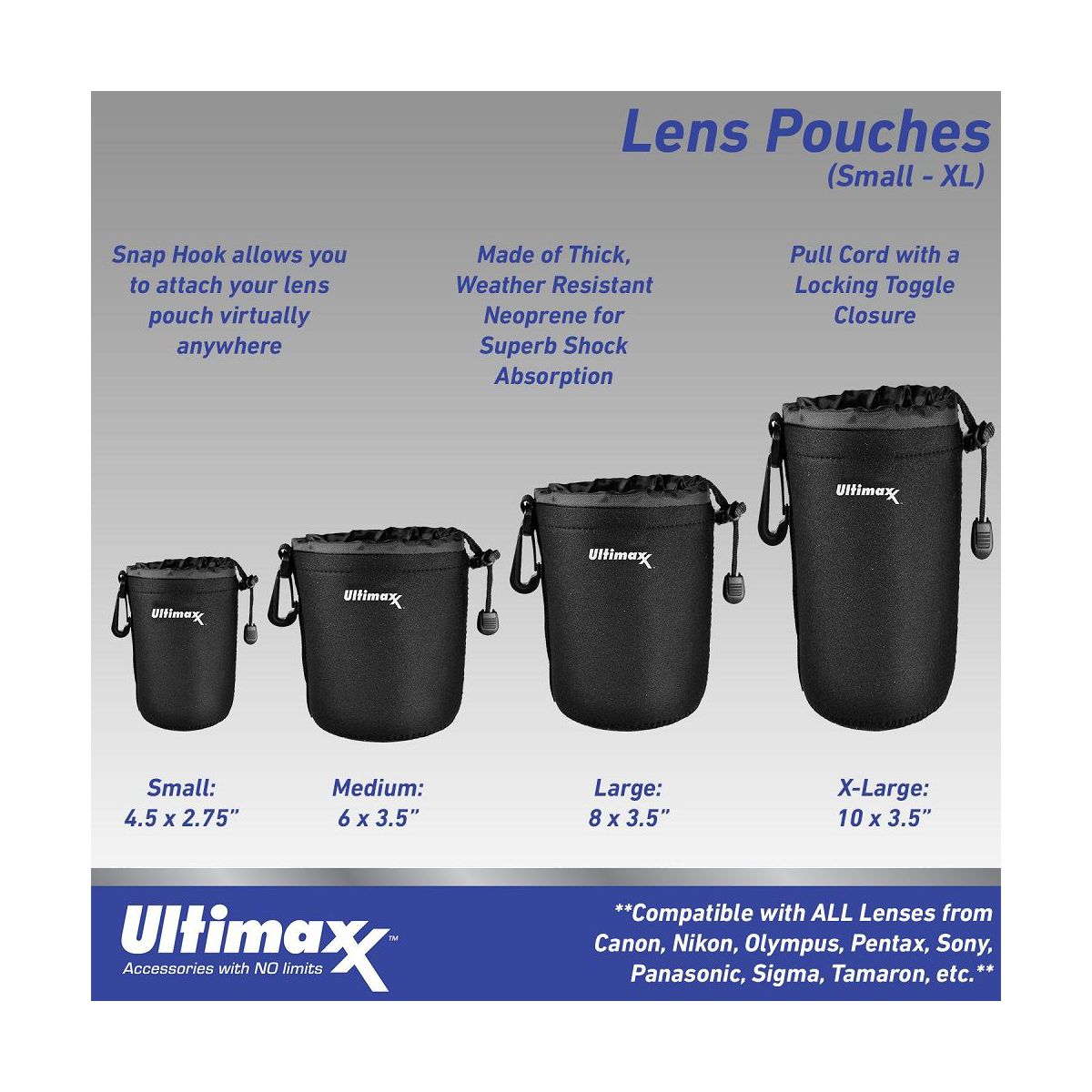 Compatible with all lenses from Canon, Nikon, Olympus, Pentax, Sony, Panasonic, Sizes: Small 4.5” x 2.75”