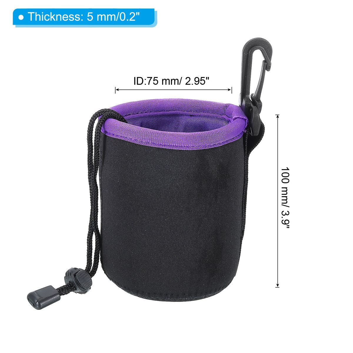 The Neoprene Lens Pouch Bag offers waterproof, shockproof, and wear-resistant protection for your camera lens. It is versatile and suitable for most lens brands, and can also be used for items like water cups. The bag provides good heat preservation and anti-scald effects. It features a strap and hook for carrying by hand or attaching to a backpack or belt. The drawstring design secures the lens, while the 5mm thick neoprene fleece protects against weather and scratches. Ensure the lens fits by checking the size before purchasing.