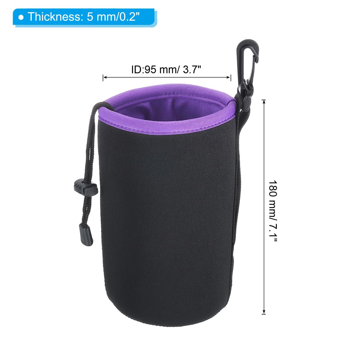 The Neoprene Lens Pouch Bag offers waterproof, shockproof, and wear-resistant protection for your camera lens. It is versatile and suitable for most lens brands, and can also be used for items like water cups. The bag provides good heat preservation and anti-scald effects. It features a strap and hook for carrying by hand or attaching to a backpack or belt. The drawstring design secures the lens, while the 5mm thick neoprene fleece protects against weather and scratches. Ensure the lens fits by checking the size before purchasing.