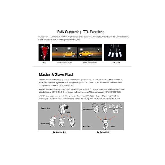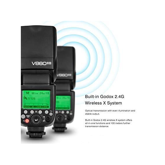Make sure this fits by entering your model number. V860IIS guarantees better light shooting experience with built-in Godox 2.4G wireless X system, GN60 high guide number, and 20 to 200 zoom flash coverage. Fully Supports TTL Functions include TTL Autoflash, Manual Flash, 1/8000s High-Speed Sync, Flash Exposure Compensation, Flash Exposure Lock, Second Curtain Sync, Modeling Flash, etc. HSS, Front Curtain Sync, Rear Curtain Sync, Multi Flash, Flash Exposure Compensation. Built-in Godox 2.4G wireless X system offers all-in-one functions and 100 meters further transmission ditance. Optical transmission with even illumination and stable output. V860IIS as a master unit to control Sony camera flashes e.g. HVL-F60M, HVL-F43M and HVL-F32M via wireless; as a slave unit under control of Sony camera flashes e.g. HVL-F60M, HVL-F43M and HVL-F32M. 2000mAh Li-ion Battery, Max. 1.5S recycle & 650 full power pops. User-friendly LCD display and control panel with firmwave upgrade.