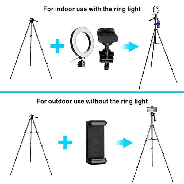 - 【Two Phone Holders】Equipped with two phone holders for different uses. One is mostly used indoors with the ring light while the other one is mostly used outdoors without the ring light.