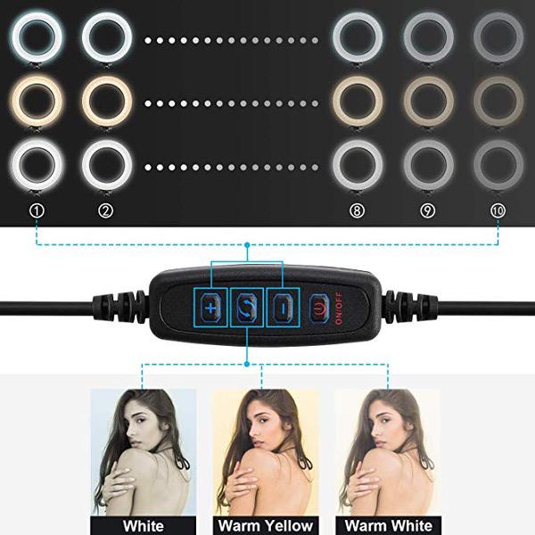 - 【5.7” LED Ring Light】3 light modes: White/ Warm Yellow/ Warm White. Each mode has 10 brightness levels.