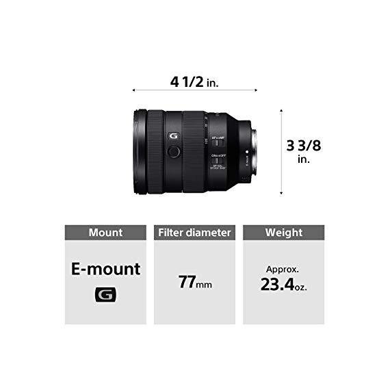 Make sure this fits by entering your model number. G-lens design with 4 aspherical and 3 ED glass (extra-low Dispersion) elements, for high corner-to-corner resolving power throughout the entire zoom range 35 mm full-frame.Constant F4 maximum aperture maintains exposure and Depth of field throughout the zoom range 9-blade circular aperture contributes to beautifuly de-focused bakgrounds Minimum focus distance- 0.38 m (1.25 feet) In-the-box: Hood (ALC-SH152), Lens front cap (ALC-F77S), Lens rear cap (ALC-R1EM), Case.Angle of View (35 mm):84°-23°