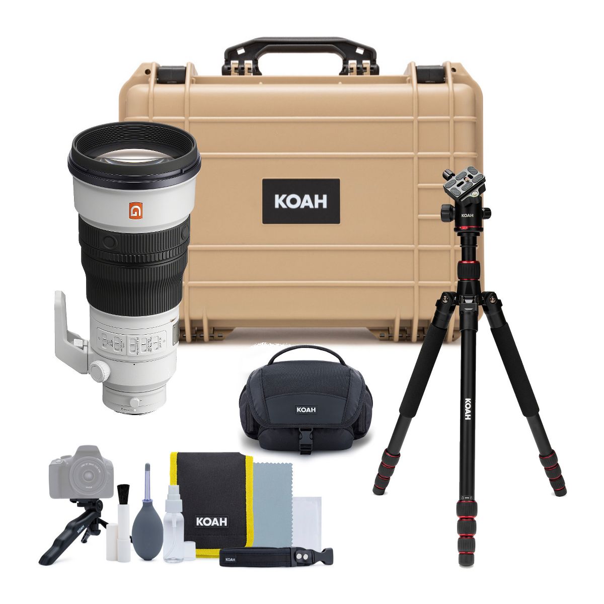 Sony FE 300mm F2.8 GM OSS Full-frame Telephoto Prime G Master LensKoah Perihelion Professional 5' Lightweight Aluminum Camera Tripod with 360-Degree Ball HeadLightweight, portable and sleek, the KOAH Perihelion Professional 5' Tripod is a reliable accessory for the modern photographer. Just like its predecessor, the Aphelion, the Perihelion features a 360-degree ball head that helps capture beautiful panoramas. And it inverts and folds for easy carrying on the go.Increased StabilityWith a load capacity of 33 pounds, the KOAH Perihelion Professional 5' Tripod provides security and stability for your DSLR, mirrorless or smartphone camera. An attached hook lowers the center of gravity for increased stability. The KOAH Perihelion tripod is built with a lightweight, tough and reliable aluminum alloy for extra strength and durability.Compact and FlexibleThe tripod can be extended up to 5 feet tall or collapsed to just 17 inches. The twist-lock legs invert and can be folded back 180 degrees, allowing easy carrying and storage. The center axis can also be inverted, allowing excellent macro photography. The metal ball head can be rotated 360 degrees, helping to expand camera activity range for panoramic shooting. The bubble level helps with judgment and accurate composition.Detachable MonopodTurn this KOAH pro tripod into a monopod or walking stick to make your photography more diverse. The monopod satisfies your needs during high-angle tilt shooting and low-angle shooting.Saramonic SR-C6 Impact-Proof Watertight and Dustproof Hard Carry Case (Black)The Saramonic SR-C6 Case with Foam is an impact-proof, crush-proof, watertight, airtight and dustproof hard case. It is incredibly rugged and perfect to carry and protect your Saramonic gear or any kind of valuable equipment and protect it from the harshest elements and the rigors of the most extreme transport.Ready to ProtectMade of a virtually unbreakable structural copolymer, it is equipped with a rugged trigger-release latch system and a customizable, two-piece pickable cubed foam set for ultimate drop and impact protection. It features a water- and dust-proof gasket seal, IP67-rated submersible design and automatic pressure equalization valve protect your valuables from water, chemicals, dust and changes in atmospheric pressure, even if submerged. Its intelligently designed polypropylene construction can also handle extreme temperatures and enormous weight without failure.Logically EquippedRemarkably lightweight, extremely rugged and compact the SR-C6 packs protection, security and function into every square inch. It features a comfortable, cushion-grip handle that seamlessly tucks away when not in use. Two security eyelets are integrated into the lid and base, perfect for TSA padlocks and mounting luggage or ID tags. Its solid, ridged perimeter design is perfectly balanced and can easily be stood up on any side.An Ideal AccessoryWith interior dimensions of 9.17 x 6.02 x 3.15 inches, the SR-C6 is perfectly sized for many Saramonic products, but also ideal for any valuable gear, such as lenses, LCD screens, tablets, LED lights, meters and so much more. A must-have for your valuable gear that needs to arrive safely as you travel from production to production.Koah Photography Cleaning KitThis Photography Cleaning Kit by Koah comes complete with a compact mini tripod, a microfiber lens cloth, a fine bristle cleaning brush, lens cleaning wipes, a lens cleaning spray bottle, a rubber bulb air blower, loop straps, and finally a small carrying pouch to store these accessories. This kit Is designed to meet the cleaning needs of various photography and video optics, binoculars and spotting scopes, filters and other glass elements.Compact TripodThe compact tripod doubles as a hand grip for easy handheld shooting, as well as a mini tabletop tripod. It features a universal screw mount for camera attachment. Made from durable material, it provides stability.Microfiber Lens ClothThe reusable microfiber lens helps keep your lenses in pristine, out-of-box condition. It can be used repeatedly to clean any optic, dry or wet, in tandem with the cleaning spray. The cloth can be hand washed and dried for repetitive use.Air BlowerThe rubber bulb air blower removes dust and debris from a lens element using the gentlest form of pressure to dislodge dust. It can help clean in cracks where a cloth cannot reach. This air blower is also a safe option for removing dust from digital camera sensors, as it does not touch any of the critical sensor components.Wrist StrapsThe wrist straps included with this kit conveniently slide around your wrist and help you maintain a secure grip over your DSLR camera for stress-free handheld shooting.Lens Cleaning SprayThe lens spray is a specially formulated liquid that helps clean your lens without leaving residue. It cleans the surfaces from smudges, fingerprints, and grime that are not removed by the air blower. This cleaner spray does not harm coated lens elements.Lens Cleaning WipesThe individually sealed pre-moistened disposable wipes will restore the clarity of your delicate lenses, removing streaks, smears or other residue. Made from micro-fine fiber weave, these absorbent sheets can also be used to wet prep your display screens before installing protective shields.Fine BrushThe fine brush easily helps cleaning hard-to-reach areas like gaps around the lens and rims of filters.Carrying CaseThis sturdy fabric case comes with a hook-and-loop fastening closure and is a perfect solution for protecting and carrying your cleaning system. It is made from high-quality nylon. This case offers quick access to your accessories. Perfect for capturing every moment..