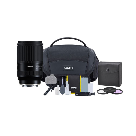 Tamron A074S 28-300mm F/4-7.1 Di III VC VXD Zoom Lens for Sony E-Mount Mirrorless CamerasThe TAMRON 28-300mm F4-7.1 VC is an all-in-one zoom lens for Sony E-mount full-frame mirrorless interchangeable lens cameras. This lens covers a broad focal length range from 28mm wide-angle to 300mm telephoto with superior imaging performance. It achieves a zoom ratio of 10.7x with a length of just 126mm (5-inch) and a weight of only 610g (21.5oz). The lens is equipped with the VXD (Voice-coil eXtreme-torque Drive) linear motor focus mechanism, enabling it to focus quickly and accurately throughout the entire zoom range. The lens also features TAMRON’s VC (Vibration Compensation) mechanism to ensure sharp hand-held images when shooting at the 300mm telephoto end and in low-light conditions. With an MOD (Minimum Object Distance) of 0.19m (7.5-inch) and a maximum magnification ratio of 1:2.8 at the wide end, the lens allows users to enjoy the world of wide macro photography. And it includes the Focus Set Button and a connector port for the dedicated TAMRON Lens Utility software independently developed by TAMRON to expand the scope of expression for still images and video. The lens features Moisture-Resistant Construction, and the front element has a protective Fluorine Coating. The new 28-300mm F4-7.1 VC lets users take photos in an extremely wide range of situations with just one lens.Koah Nostrand Avenue Camera System Gadget Bag with Accessory and Cleaning KitThe Nostrand Avenue Camera System Gadget Bag from Koah is a semi-soft carrying case that fits one DSLR camera and up to two lenses and accessories. Designed with keeping easy access in mind, it features a large top cover that protects your camera/camcorder and gear from rain and sand. It also allows for quick access to your camera and is secured with a snap coupler. An extended zipper pulls add to the bags convenient design.Additional StorageThe Nostrand Avenue Bag comes with additional front and side zippered pockets for holding accessories like a spare battery, charger, HDMI cable, and memory card. With the included shoulder strap and sturdy design, you can take it with you virtually anywhere. Also included with this bag is an optics care and cleaning kit.Koah Photography Cleaning KitThis Photography Cleaning Kit by Koah comes complete with a compact mini tripod, a microfiber lens cloth, a fine bristle cleaning brush, lens cleaning wipes, a lens cleaning spray bottle, a rubber bulb air blower, loop straps, and finally a small carrying pouch to store these accessories. This kit was designed to meet the cleaning needs of various photography and video optics, binoculars and spotting scopes, filters and other glass elements.iZonix Pro Series 67mm Multi-Purpose Multi-Coated HD 3-Piece Digital Filter Set for Digital CamerasThe iZonix Pro Series 67mm Multi-Coated HD 3-Piece Digital Filter Set is a versatile accessory designed for digital cameras, video cameras, and lenses. This filter set includes Ultraviolet (UV), Circular Polarizer (CPL), and Fluorescent (FL-D) Filters.Ultraviolet (UV) FilterThe Ultraviolet filter is a multi-purpose filter that absorbs ultraviolet rays, which can often make outdoor photographs appear hazy and indistinct. It serves as a fine-weather filter for both color and black and white photos. Additionally, it serves as a permanent lens protector.Circular Polarizer (CPL) FilterThe Circular Polarizer filter removes unwanted reflections from non-metallic surfaces such as water, glass, etc. It enables colors to become more saturated and appear clearer, with better contrast.Fluorescent (FL-D) FilterThe Fluorescent filter corrects the green cast created when using daylight under fluorescent lamps with daylight tubes. Perfect for capturing every moment..