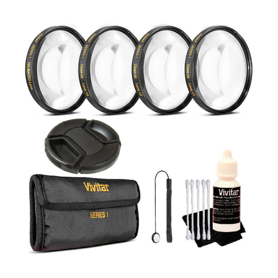 The Vivitar Close-up Macro Lens Set includes a +1, +2, +4 and +10 close up lenses. The high quality optical magnifying lenses are diopter for close up photography, which shorten the close focusing distance of the lens. It allows the lens to go closer to the subject than before and to achieve a larger image scale. Lenses can be used individually or in combination for maximum effect. I.e.+1 & +2 to make +3 effect or +4 & +2 to make +6 effect. Vivitar's pouch for filters is constructed of strong, durable material and is well padded for assuring high quality, scratch free storing. Lens cleaning kit from Vivitar includes 3 types of cleaning tools that can keep optics dust, dirt and smudge free. A microfiber cleaning cloth provides the ability to quickly wipe clean front lens element, filters or viewing screen of camera or smartphone. For small areas where microfiber cloth can't reach, 5 swabs are supplied with each having two absorbent ends on a small plastic handle. A bottle cleaning fluid is also provided when stubborn spots are encountered. Fluid may be applied to microfiber cloth or swabs for advances cleaning.Side pinch lens cap snaps unto lens to protect from scratches, moisture, dirt and fingerprints . Lens cap keeper prevents the loss of lens cap. An adhesive-backed disc secures the lens cap to an elastic leash which wraps around the lens barrel. When lens cap is removed from lens while shooting it hangs out of the way yet secure and within reach for easy retrieval.