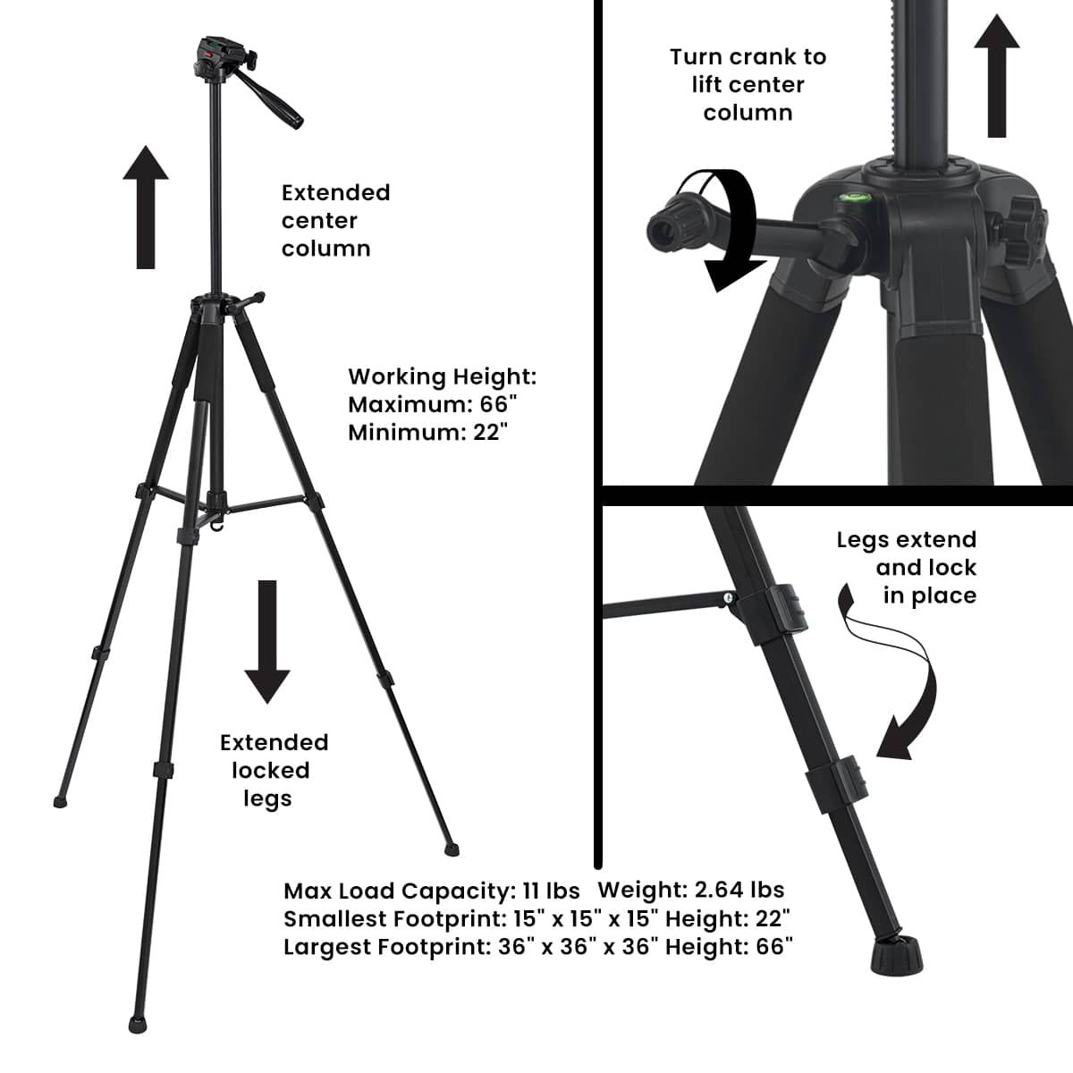 The adjustable height is achieved through telescoping legs and a geared center column, accommodating a wide range of shooting angles and perspectives. This feature makes it a versatile tripod for DSLR professional use, capable of adapting to various photographic requirements. Two built-in bubble levels guarantee that your camera tripod stand remains perfectly centered, even on uneven ground. For added stability, the tripod includes a counterweight hook where you can hang a sandbag or backpack.