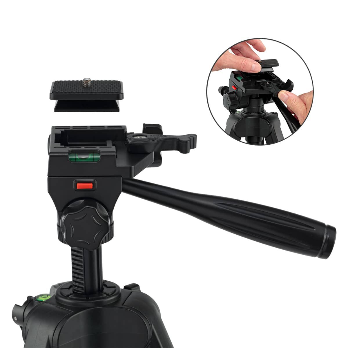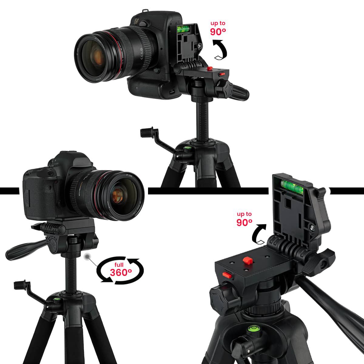 The tripod features a 360° pan rotation and a 90° tilt, allowing for forward, backward, and side tilt adjustments. This provides you with complete control over your camera's positioning, ensuring precise framing for every shot.