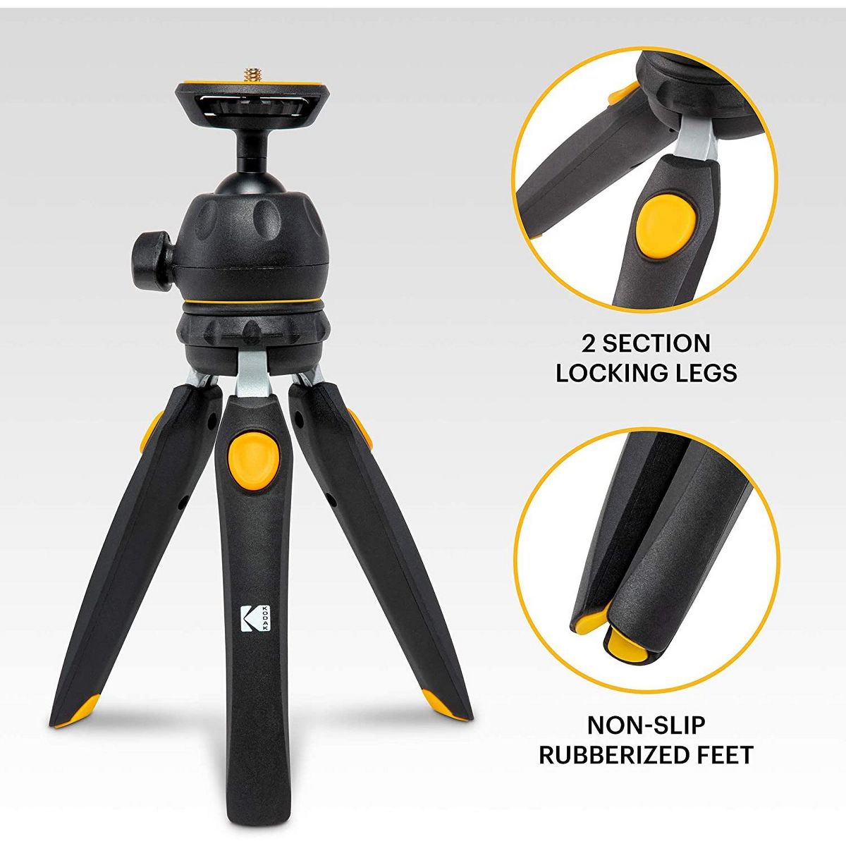 Get a distinctive angle for any picture using the 360° ball head to tilt or pan your camera or phone. The adjustable, convenient & compact design makes this camera stand tripod the perfect travel partner for any photographer, Youtuber, or vlogger. Set up this lightweight compact tripod anywhere to get your perfect snapshot, then easily pack up and take it somewhere else. Use this durable, reliable travel tripod for camera to take countless photos. Set up for the ideal picture at another event, trip, party, or landmark with this state-of-the-art phone tripod with remote from Kodak. Shoot steadily—add a KODAK Mini Adjustable Tripod to your cart today!