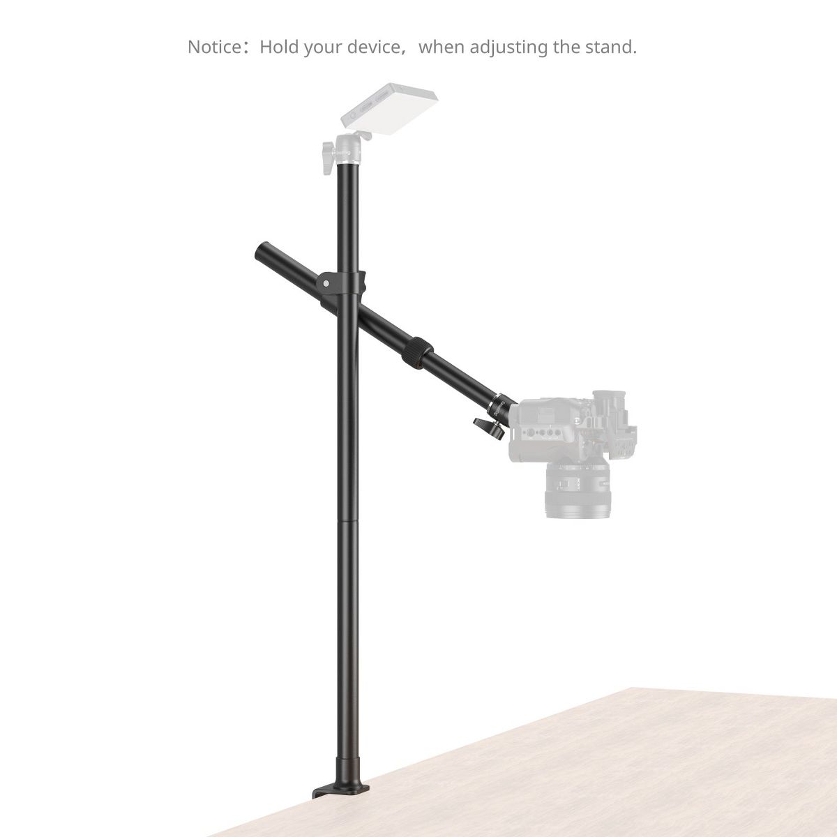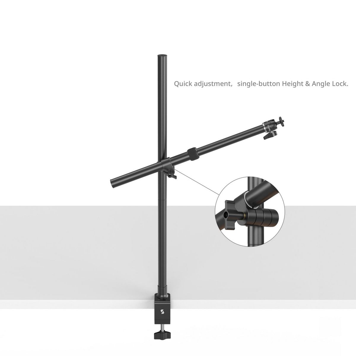 The top of the main arm features a 1/4"-20 threaded hole, while the top of the boom arm is equipped with a detachable 360° ball head, allowing the desktop support to attach two devices simultaneously, offering a convenient desktop shooting solution.