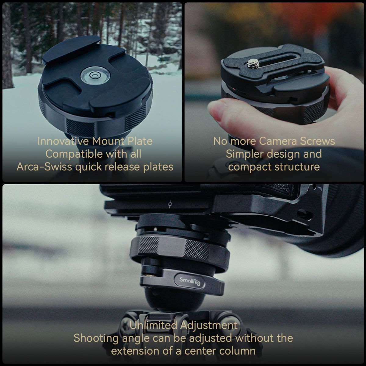 · Compact Ball Head with Integral Compatibility: The inverted ball head design enhances portability, supports Arca-type QR plates, and allows vertical shooting.