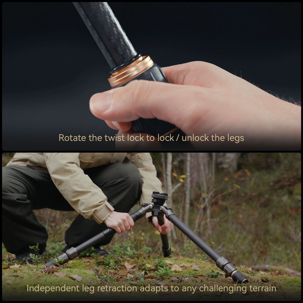 · Thickened Carbon Fiber Material: Made from 1.2mm carbon fiber, the tripod supports up to 15kg and weighs only 1.38kg, suitable for medium to long focal length lenses.