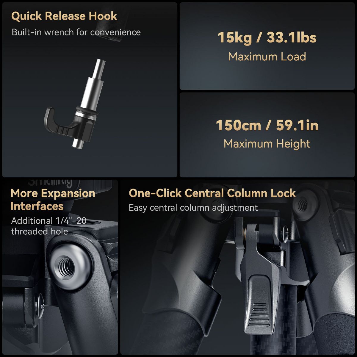 · Multi-functional Central Column: Features a quick-lock lever for fast adjustments and a detachable short column for low-angle shots at 13cm.