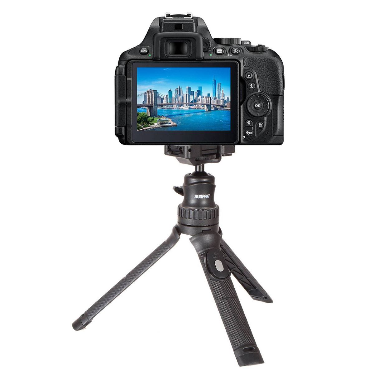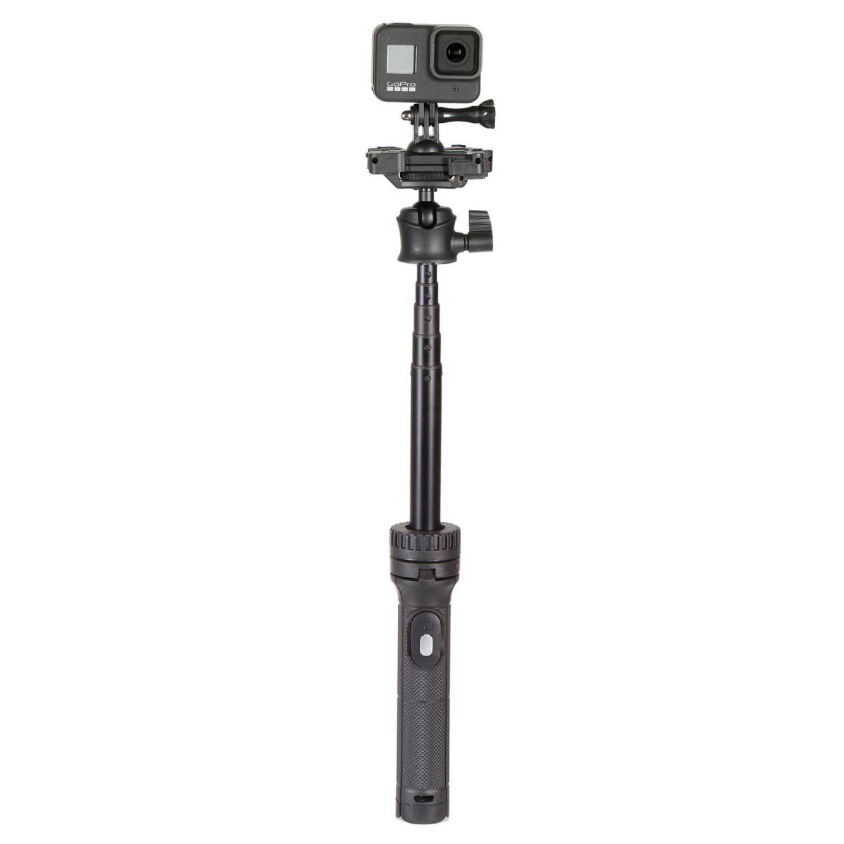 The Sunak VersaPod is a combination tabletop tripod and handheld mount all in one. It has a fully telescopic 6-section column and foldable legs with non-marring rubber tips. When the legs are held together, it transforms into a handheld unit for portable usage or selfies. The Bluetooth remote integrated into the leg allows you to take pictures and videos with your Apple or Android smartphone up to 30 feet away. The kit is designed for compact cameras, smartphones and GoPro.