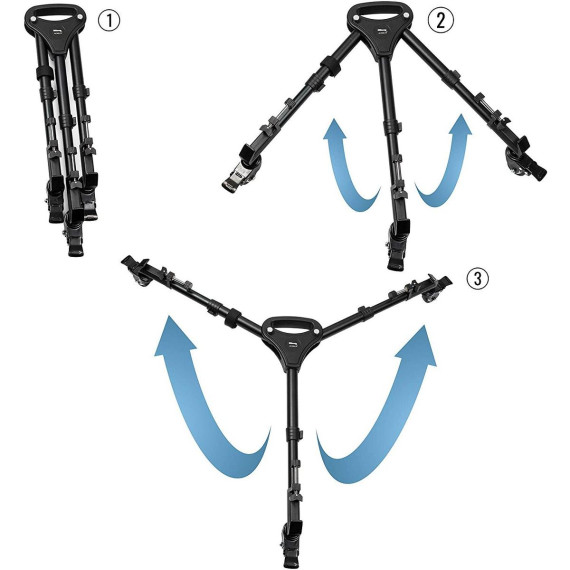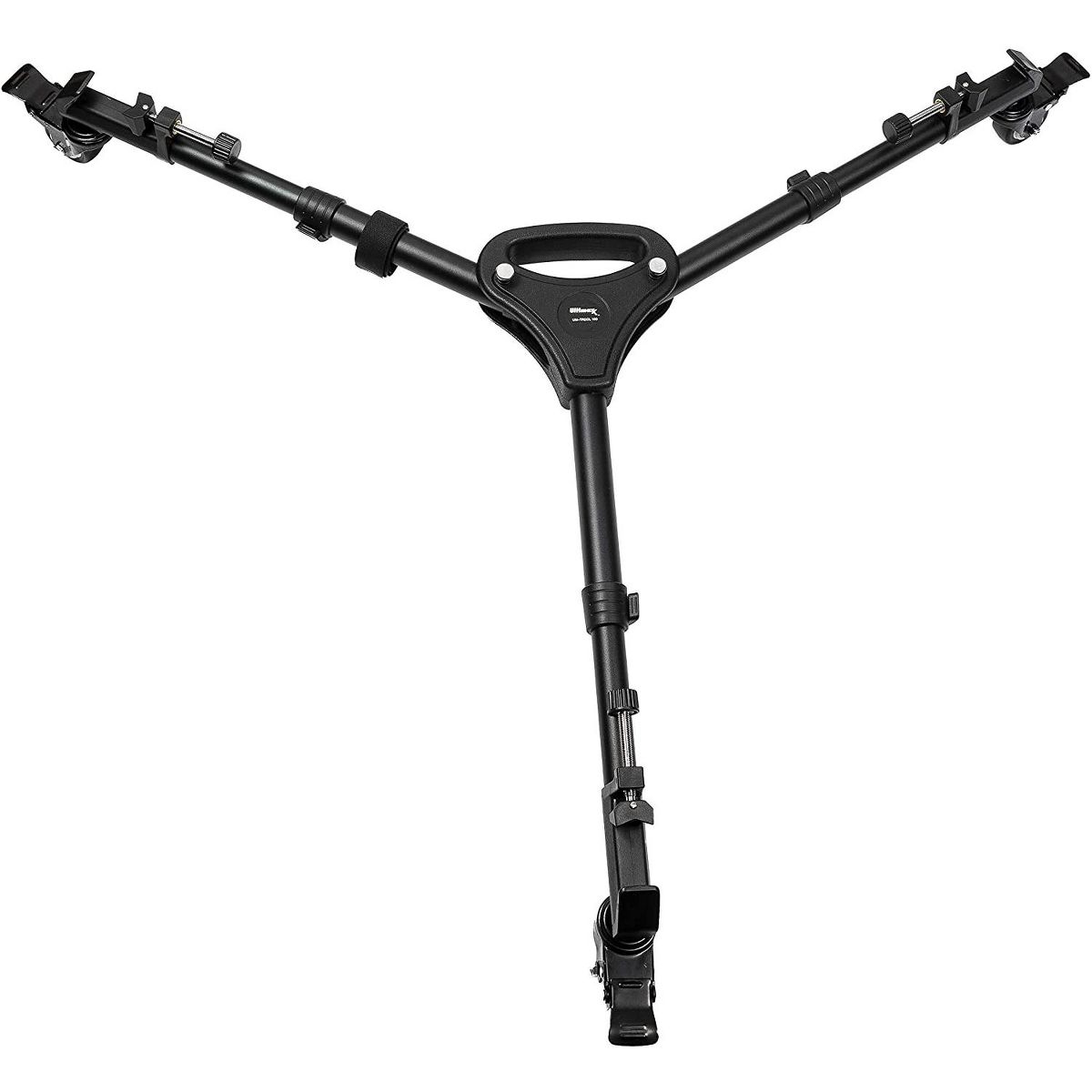Ultimaxx Professional Heavy Duty Tripod Dolly With Adjustable Legs: Expand your filming capabilities with the Ultimaxx Professional Heavy Duty Tripod Dolly with Adjustable Legs. This portable dolly has three 2" wheels, turning any tripod into a wheeled wonder which can quickly move across the studio floor or change angles without moving the camera's position. The adjustable base accommodates nearly any tripod. Smooth-gliding rubber wheels won't shake the camera during transport. Step on the wheel locks to secure the tripod in place once you've found the perfect position. Ready to pack up? Fold up the tripod dolly into a neat, 16.5" package, and grab it by the carrying handle to move it from place to place.