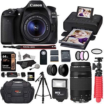 Canon 80D DSLR Camera EF-S 18-55mm is STM Kit with EF 75-300mm III Telephoto Lens and Canon Selphy Printer CP1300 Printer (Black), Lexar 64GB U3 Memory Card Bundle