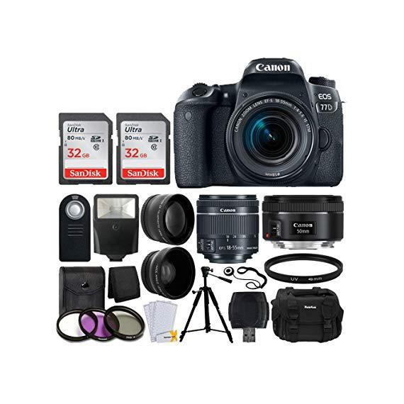 Canon EOS 77D Digital SLR Camera + Canon EF-S 18-55mm f/4-5.6 IS STM Lens + Canon EF 50mm f/1.8 STM Lens + Wide Angle & Telephoto Lens + Photo4Less DC59 Gadget Bag + Wireless Remote + Accessory Bundle