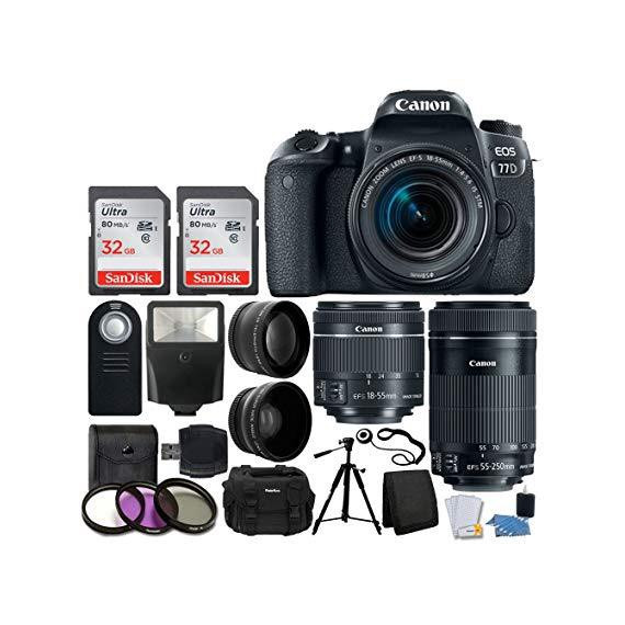 Canon EOS 77D DSLR Camera + Canon EF-S 18-55mm f/4-5.6 IS STM Lens + Canon EF-S 55-250mm f/4-5.6 IS STM Lens + Wide Angle & Telephoto Lens + 64GB Memory Card + Wireless Remote + Value Accessory Bundle