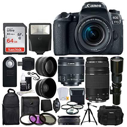 Canon EOS 77D DSLR Camera + Canon EF-S 18-55mm is STM Lens + Canon EF 75-300mm III Lens + Wide Angle & Telephoto Lens + 64GB Memory Card + Telephoto 500mm f/8.0 (Long) + Wireless Remote + Accessories