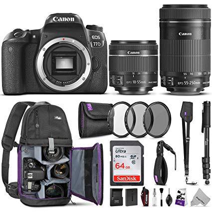 Canon EOS 77D DSLR Camera with 18-55mm is STM and 55-250mm Lenses Kit w/Advanced Photo and Travel Bundle - Includes: Canon USA Warranty, Altura Photo Backpack, SanDisk 64gb Card, Monopod, Filter Kit