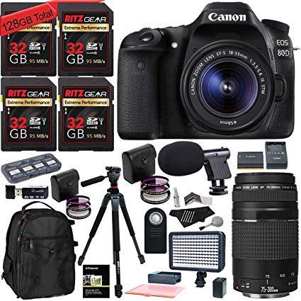 Canon EOS 80D DSLR 18-55mm is STM Camera Kit, 128 GB of Memory Cards (U3), 75-300mm Lens, Camera Bag, Ritz Gear 60" Tripod, Macro Lenses, 2 Filter Sets Warranty