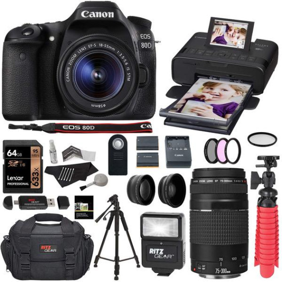 Canon EOS 80D DSLR Camera, Kodak Print Dock with Paper, EF 75-300mm III Telephoto Lens, Tripod, Lexar 32GB U3 Memory Card Bundle