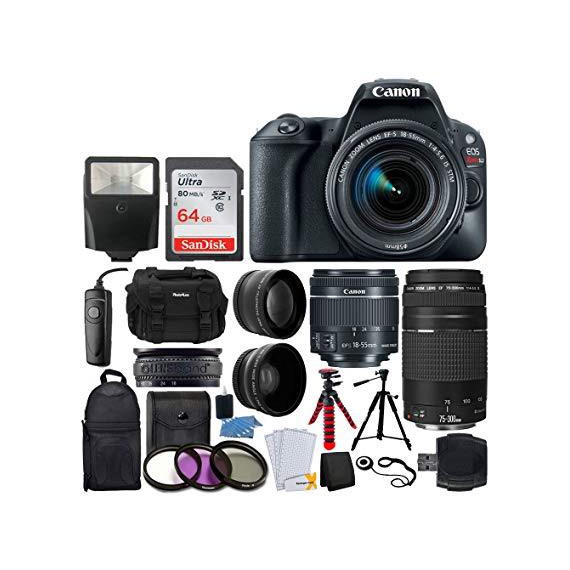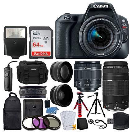 Canon EOS Rebel SL2 DSLR Camera + EF-S 18-55mm IS STM + EF 75-300mm III + 64GB Memory Card + Wide Angle & Telephoto + RS-60 Remote Switch + Slave Flash + Quality Tripod + Case & Backpack – Full Bundle