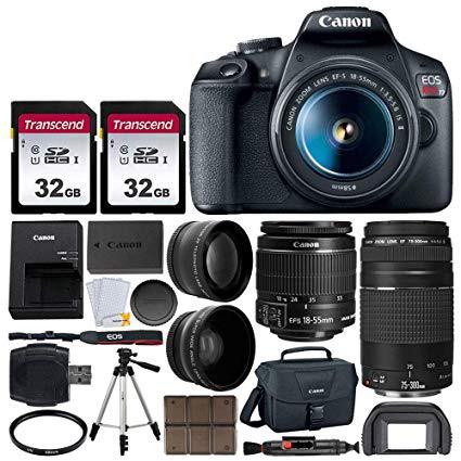 Canon EOS Rebel T7 Digital SLR Camera + EF-S 18-55mm f 3.5-5.6 is II Lens + EF 75-300mm f/4-5.6 III Lens + EOS Shoulder Bag + 32GB Memory Card + 58mm Wide Angle & Telephoto Lens + Tripod + UV Filter