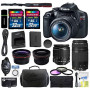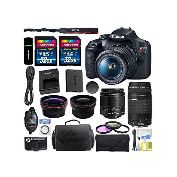 Make sure this fits by entering your model number. KIT INCLUDES: Canon EOS Rebel T7 DSLR 24.1MP HD 1080p Camera - EF-S 18-55mm f/3.5-5.6 IS II Lens - EF 75-300mm f/4-5.6 III Lens - LP-E10 Lithium-Ion Battery Pack - LC-E10 Battery Charger - Eyecup EF - RF-3 Body Cap - EW-400D Neck Strap - Battery Cover - Limited 1-Year Warranty 58mm High Definition Wide Angle Lens + 58mm 2x Professional Telephoto Lens + Camera Case + 3-piece Filter Kit (UV-CPL-FLD) + Hand Camera Grip 2 of Transcend 32GB High Speed SDHC Class 10 Flash Memory Card + SD USB Card Reader + Memory Card Wallet + Lens Band and Zoom Creep Preventer + Vidpro Camera and Lens Cleaning Kit 24.1MP APS-C CMOS Sensor - DIGIC 4+ Image Processor - 3.0" 920k-Dot LCD Monitor - Full HD 1080/30p Video Recording - 9-Point AF with Center Cross-Type Point ISO 100-6400, Up to 3 fps Shooting - Built-In Wi-Fi with NFC - Scene Intelligent Auto Mode - Creative Filters and Creative Auto Modes