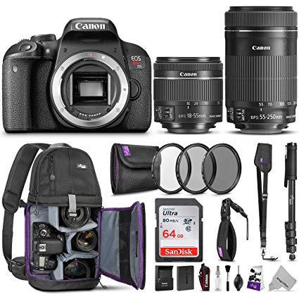 Make sure this fits by entering your model number. INCLUDES: Canon EOS Rebel T7i DSLR Camera with 18-55mm Lens + Canon EF-S 55-250mm f/4-5.6 IS STM Lens + Altura Photo Sling Backpack + Altura Photo Compact 62-Inch Monopod + Altura Photo Rapid Fire Wrist Strap + SanDisk 64GB Ultra UHS-I SDXC Memory Card (Class 10) + Altura Photo Neck Strap + Altura Photo 58MM Filter Kit (UV-CPL-ND4) + Altura Photo Cleaning Kit + Premium MagicFiber Microfiber Lens Cleaning Cloth FEATURING a 24.2MP APS-C CMOS sensor and DIGIC 7 image processor, the T7i is capable of producing high-resolution imagery with notable clarity and minimal noise. FULL HD 1080p Video Recording, 45-Point All Cross-Type AF and Dual Pixel CMOS AF Systems, Body Design and Built-In Wi-Fi, NFC and bluetooth. CANON brand accessories included: Canon EOS Rebel T7i DSLR Camera + EF-S 18-55mm f/4-5.6 IS STM Lens + EF-S 55-250mm f/4-5.6 IS STM Lens + LP-E17 Lithium-Ion Battery Pack + LC-E17 Charger for LP-E17 Battery Pack + Eyecup Ef + RF-3 Body Cap + EW-400D Wide Strap + Canon Limited 1-Year Warranty CANON AUTHORIZED DEALER. Includes Canon USA Warranty.